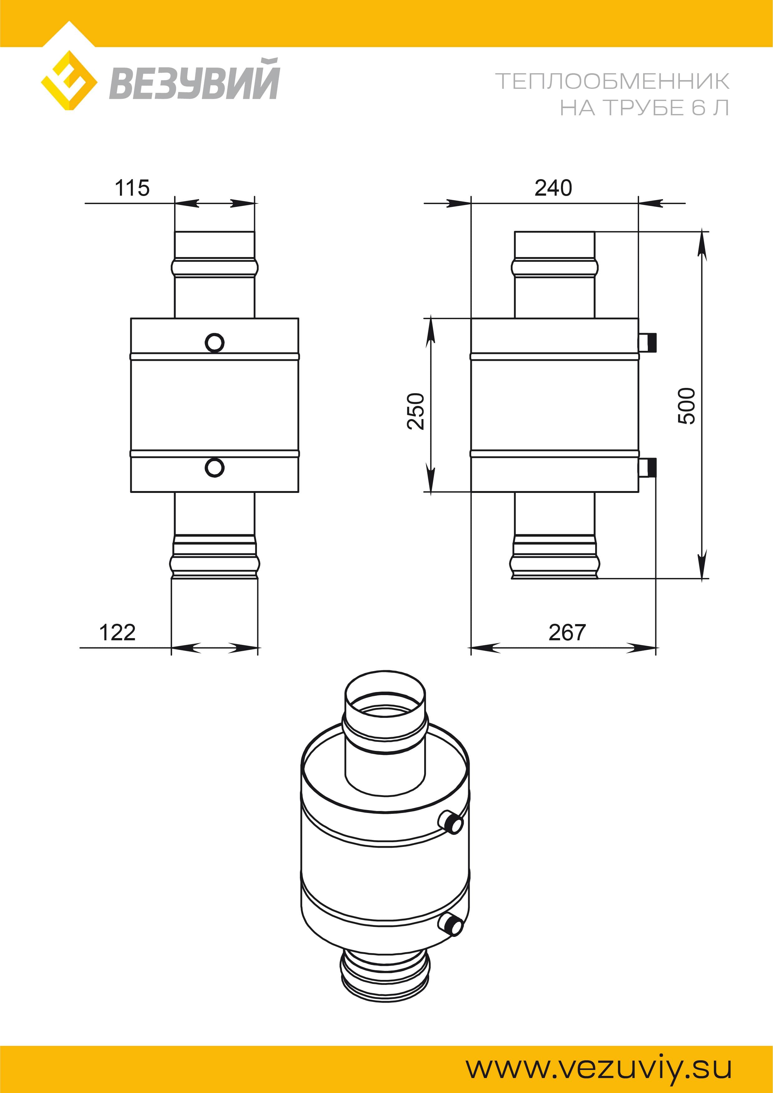 Теплообменник Везувий, стальной бак на трубу банной печи диаметром 115мм, объемом 6литров, штампованный, из нержавеющей стали AISI 439.