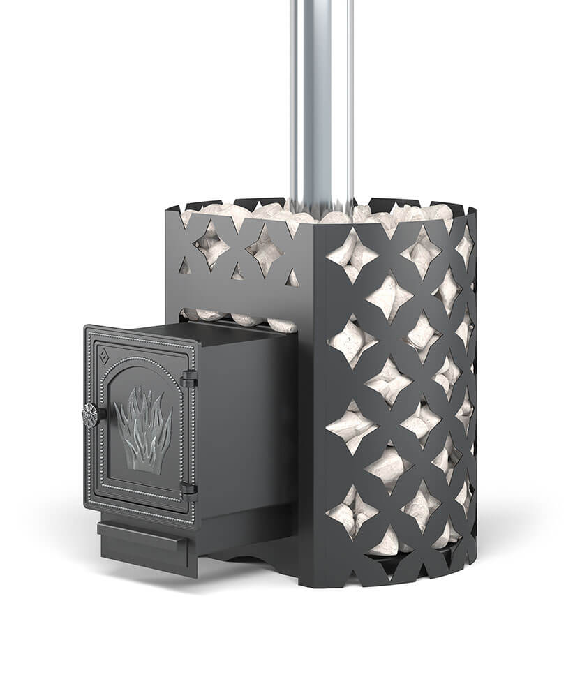 Дровяная печь для бани с чугунной топкой ЭТНА 18 (ДТ-4) сеткой кожухом для камней, отапливает парное помещениебани объемеом 18 м3.