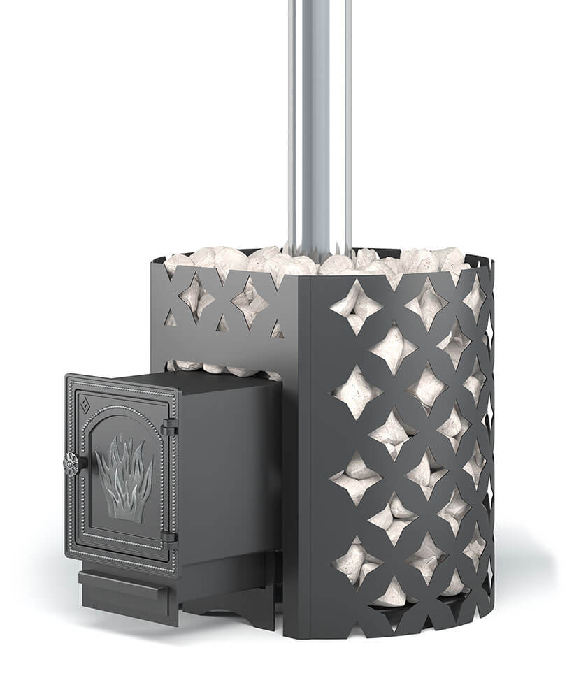 Для устройства наружной открытой каменки печь ЭТНА 24 оснащается металлическим кожухом с прорезным рисунком оригинального дизайна. Пространство между печью и кожухом из двухмиллиметровой стали заполняется камнями для бани, которые выполняют роль теплонакопителя, перераспределяют тепло от стенок топки и защищают парящихся от жёсткого инфракрасного излучения. Воду подают на нагретые камни, с которых полученный пар распространяется по всему объёму парной. Кожух диаметром 620 миллиметров вмещает в себя до 130 килограммов камней крупной и средней фракции.