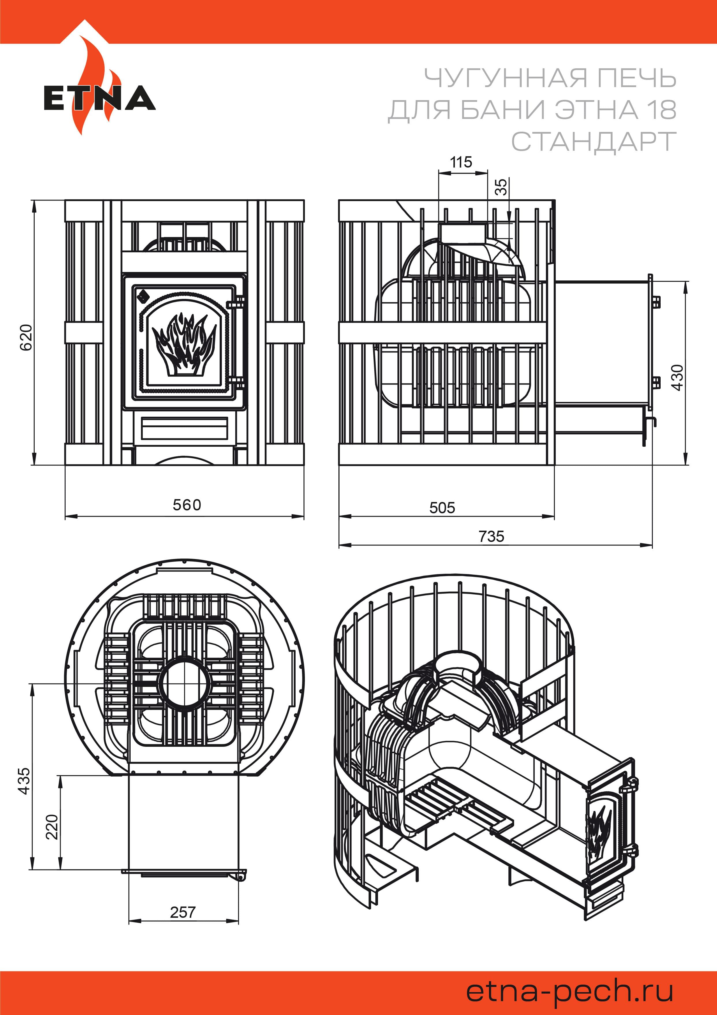 Дровяная, чугунная банная печь ЭТНА 18 (ДТ-4С) Стандарт, с выносом топки, топистя из смежного помещения, с чугунной дверкой со стеклом, рассчитана на обогрев парильного помещения от 8 до 18 м3.