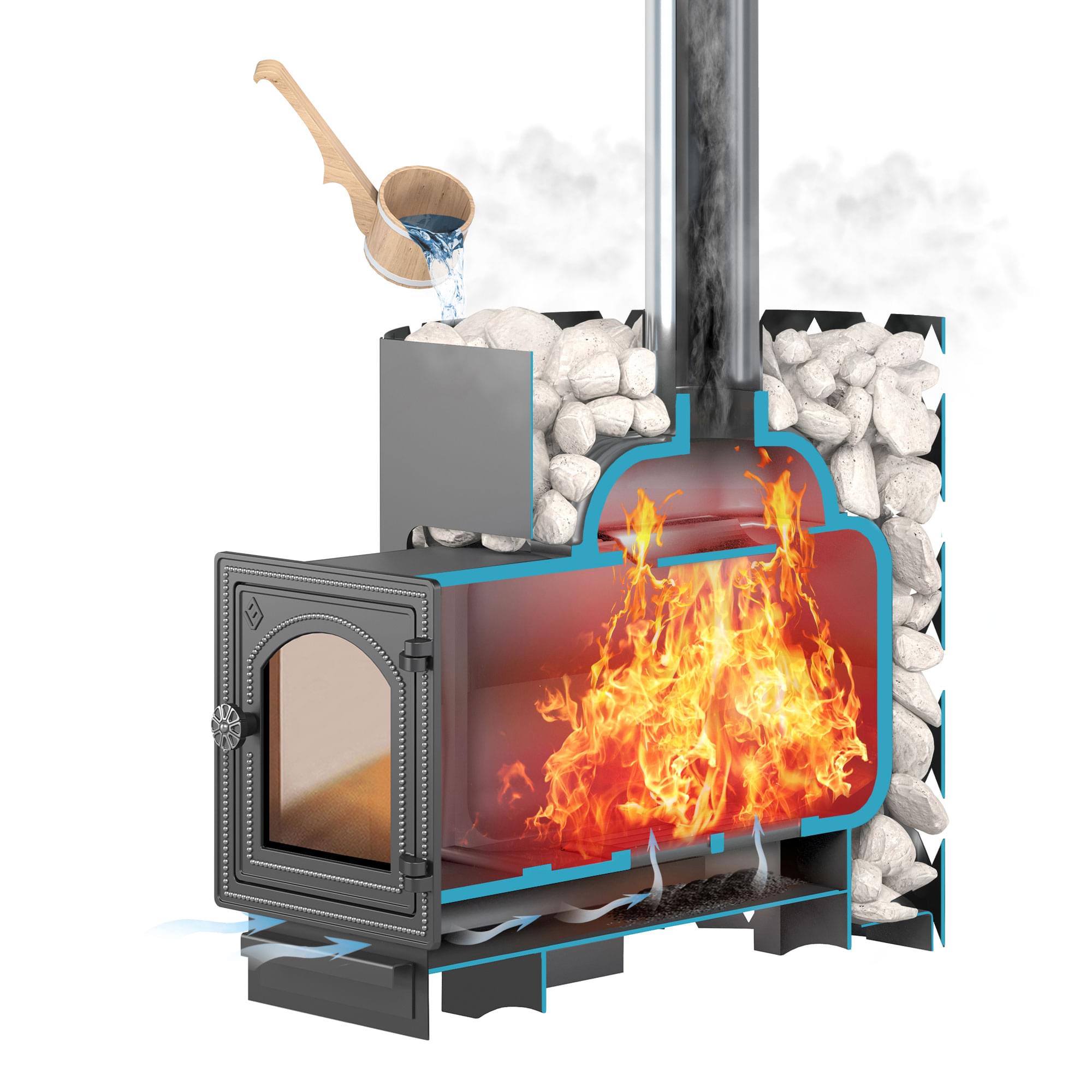 Дверка печи (ДТ-4С) изготовлена из высококачественного чугуна, не меняющего своих пропорций при длительном нагреве. Через дверку проводится обслуживание печи, подкладывание дров и контроль горения топлива. Дверка делает топку печи безопасным и удобным процессом. Конструктивно дверка вынесена в смежное с парилкой помещение (предбанник, комната отдыха), откуда и производят обслуживание топочного пространства.