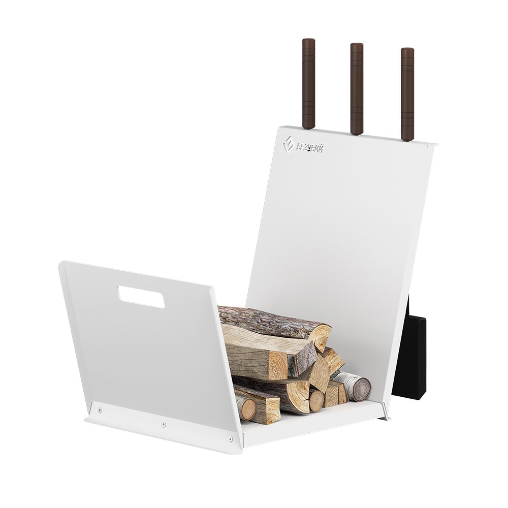 Дровница разборная, изготовлена из стального листа толщиной 1,5 мм, покрыта белой краской, устойчивой к внешним воздействиям.В комплект входят щетка, совок и кочерга.