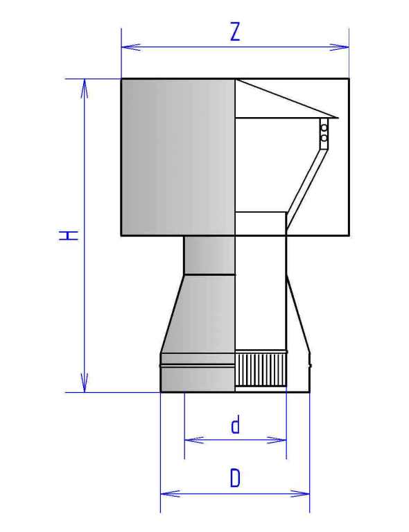 Дефлектор состоит из трубного элемента и расположенного над ним экранирующего элемента цилиндрической формы. Элементы соединены друг с другом перемычками, закрепленными точечной сваркой. По конструктивным особенностям дефлектор 2Д является утепленным. Диапазон диаметров: 115, 130, 150, 180, от 200 до 1200 (с шагом 50 мм)