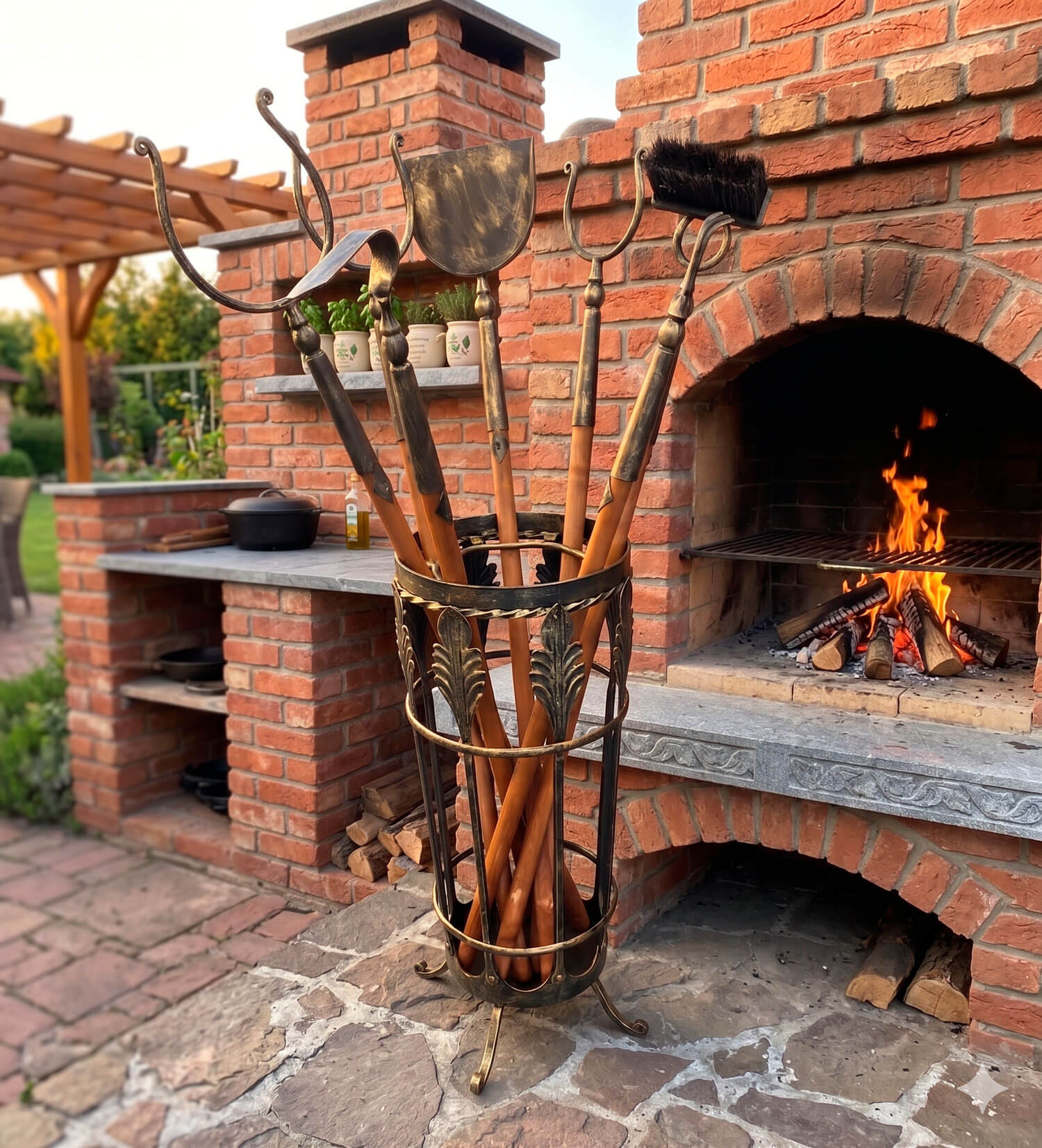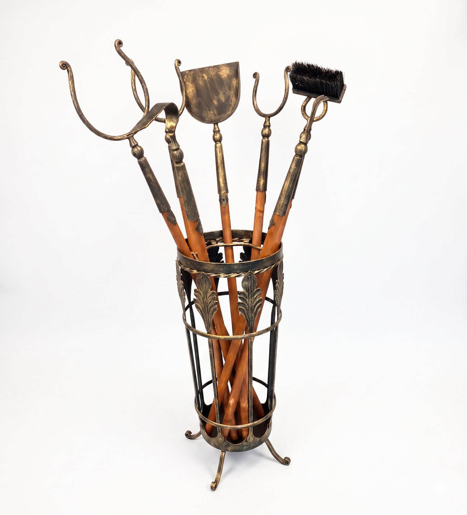 Набор аксессуаров для русской печи, размещен в кованной корзине подставке. В комплекте восемь предметов: