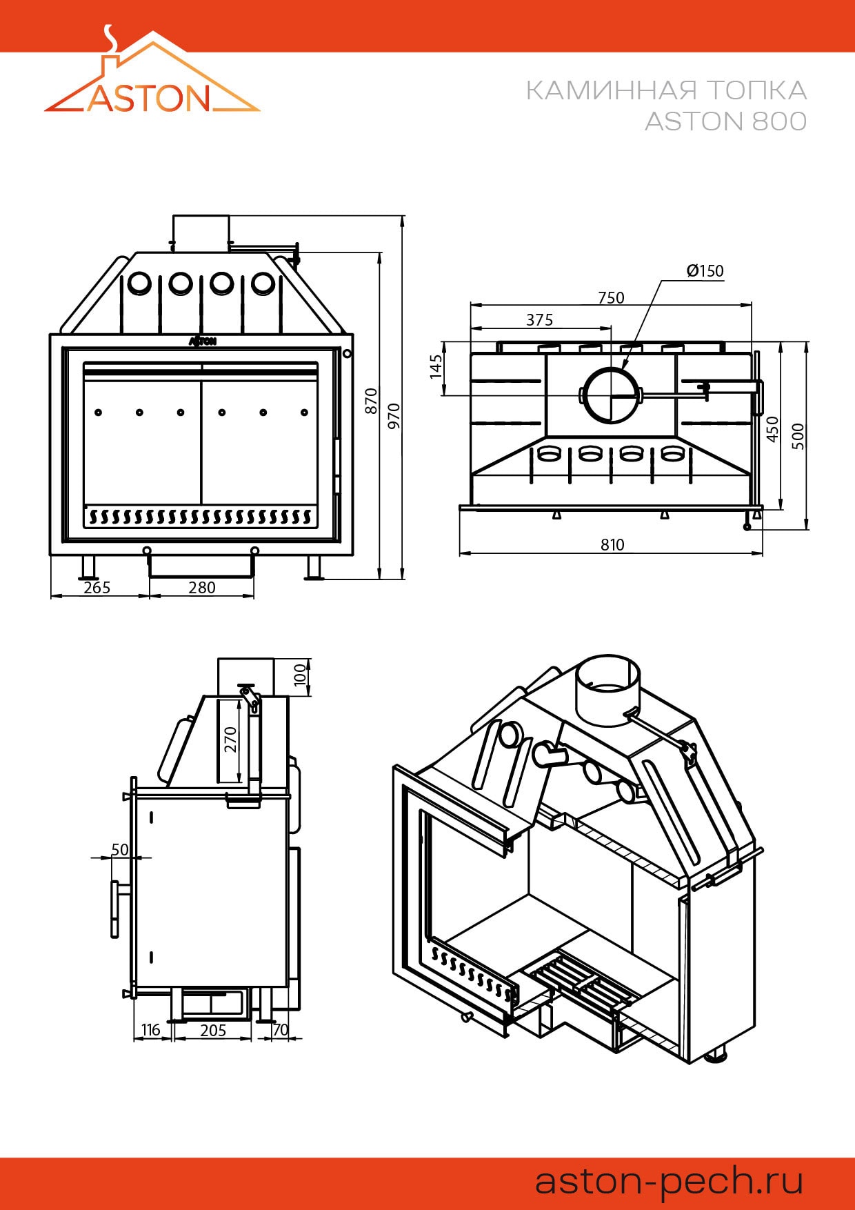Стальная каминная топка ASTON 800 длительного горения с вторичным дожигом, с большим фронтальным стеклом, топка футерована вермикулитом, отопительная мощность 15 кВт, отапливаемый объем до 330 м3.