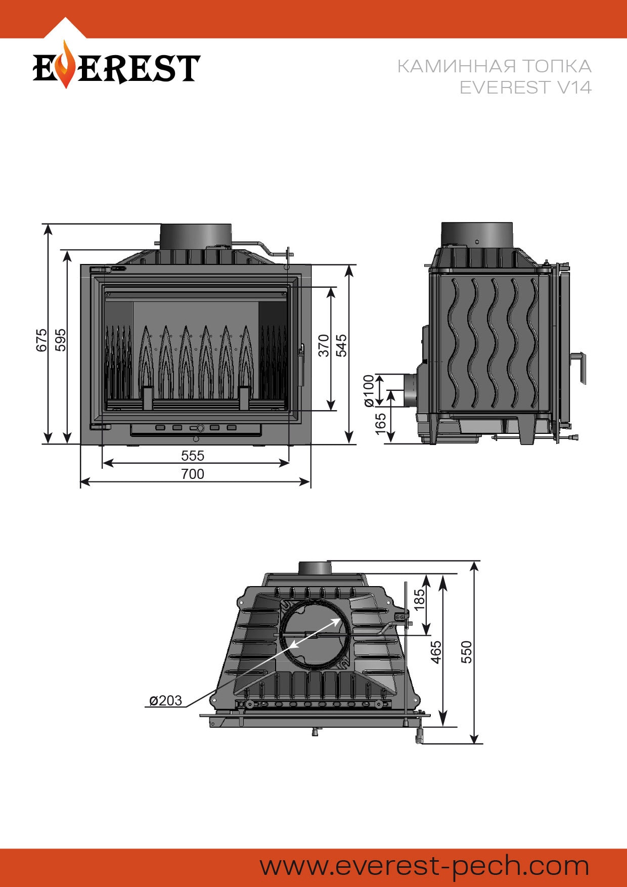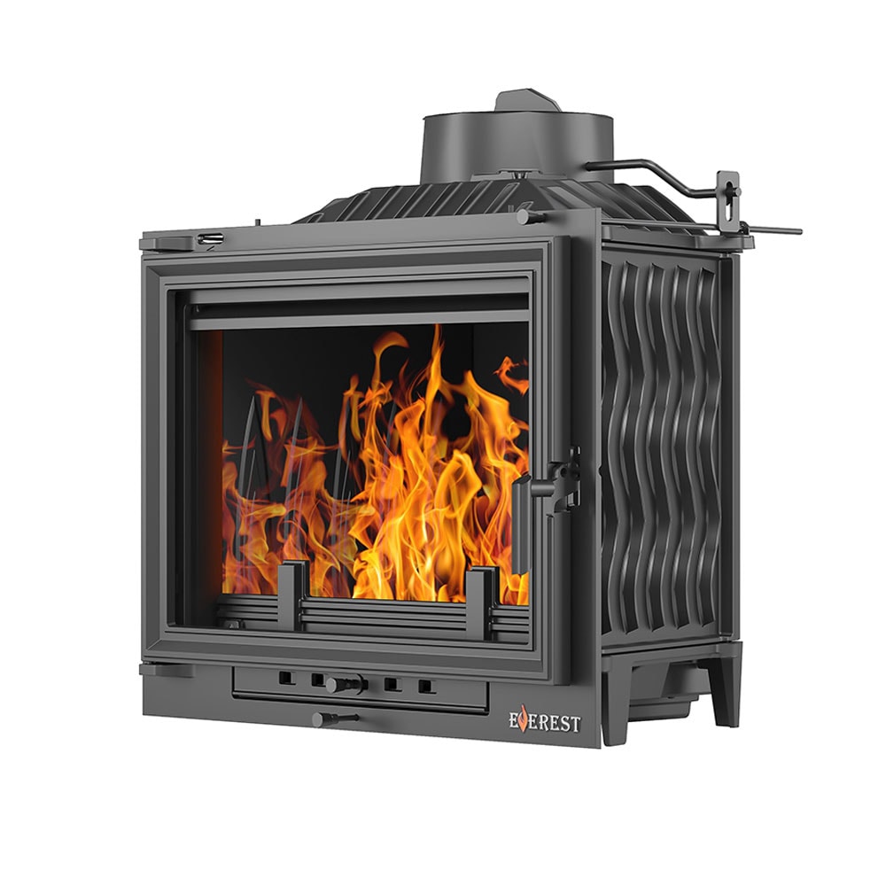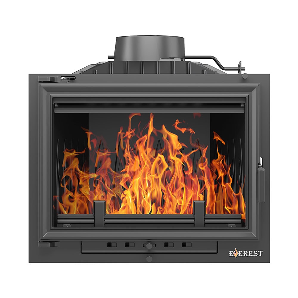 Каминная топка EVEREST V14 изготовлена из качественного жаростойкого чугуна с толщиной стенок 6-8мм. Вес печи составляет 120 кг. Модель рассчитана на обогрев помещений объёмом до 280м³. Каминная топка имеет пламегаситель, который обеспечивает высокий КПД . Топка усилена чугунной задней вставкой с системой вторичного дожига. С помощью этой функции по каналам подачи вторичного воздуха поступает воздух, который нагревается при прохождении между топочной камерой и стенками корпуса. Далее нагретый воздух через дефлектор поступает в топку, перемешивается с газами - продуктами горения, чем вызывает повторное возгорание. Регулировка этой системы, осуществляется рычагом, расположенным в нижней части топки. На зольном ящике имеется ручка регулировки подачи воздуха в топку в колосниковую зону. В левой верхней части расположена ручка регулировки системы чистое стекло, которая препятствует оседанию сажи на внутреннюю поверхность стекла. На задней стенке расположен приточный патрубок диаметром 100мм, который дает возможность подвести приток воздуха вне комнаты. Патрубок дымохода с внутренним диаметром 203 мм, оснащён поворотным шибером. Заслонка сделана из чугуна, а её положение регулируется ручкой на передней панели топки.
