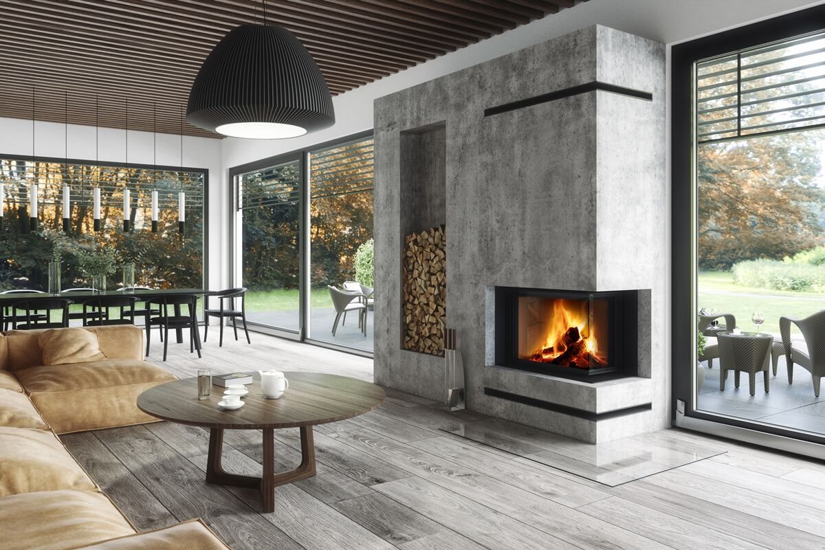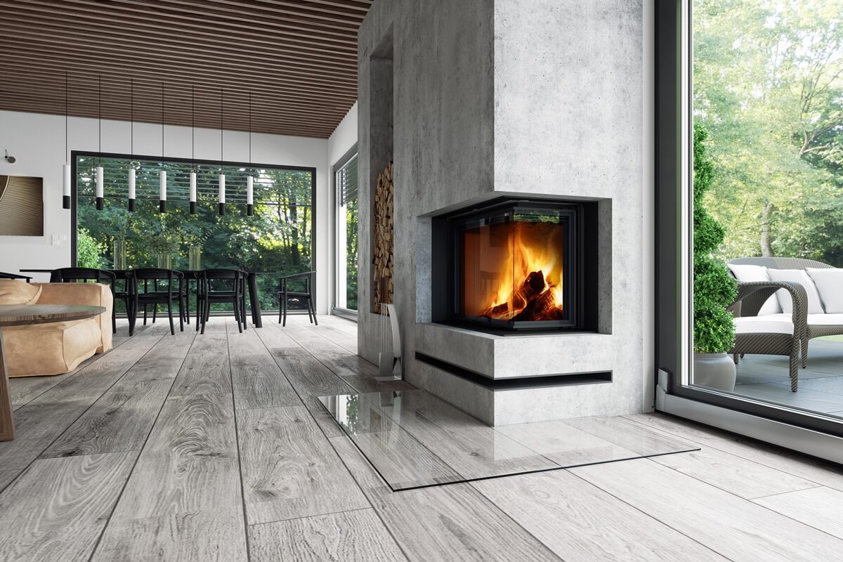 Каминные топки IMPRESSION имеют необычно высокие стеклянные окошки, открывающие роскошный вид на огонь. Угловое остекление (левое и правое) состоит из двух частей.