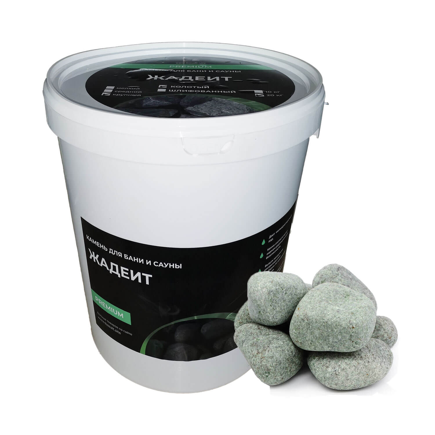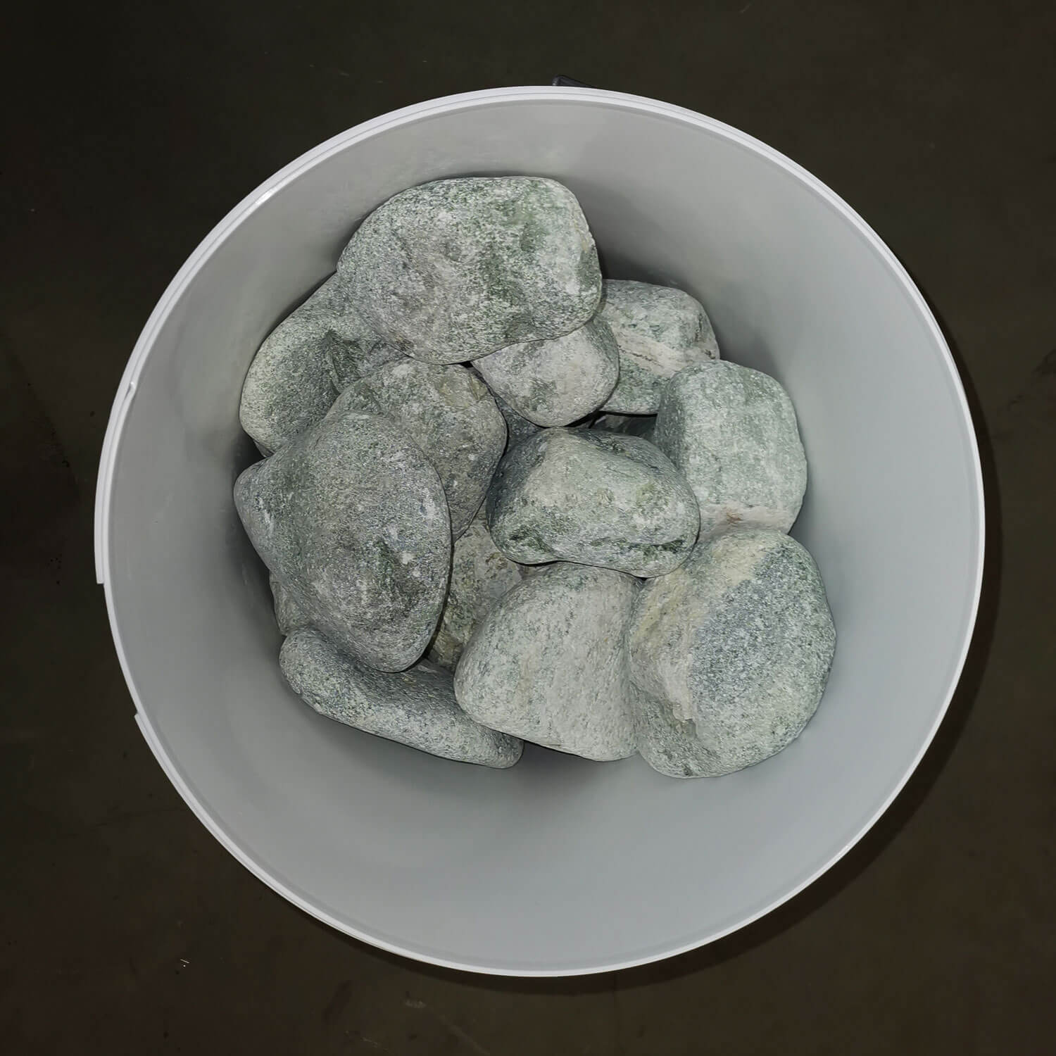 Камни для бани и сауны Жадеит – шлифованный, средний, в упаковке пластиковое ведро 20 кг, произведен в Республике Хакасия, предназначен для закладки в каменку дровяной или электрической банной печи.