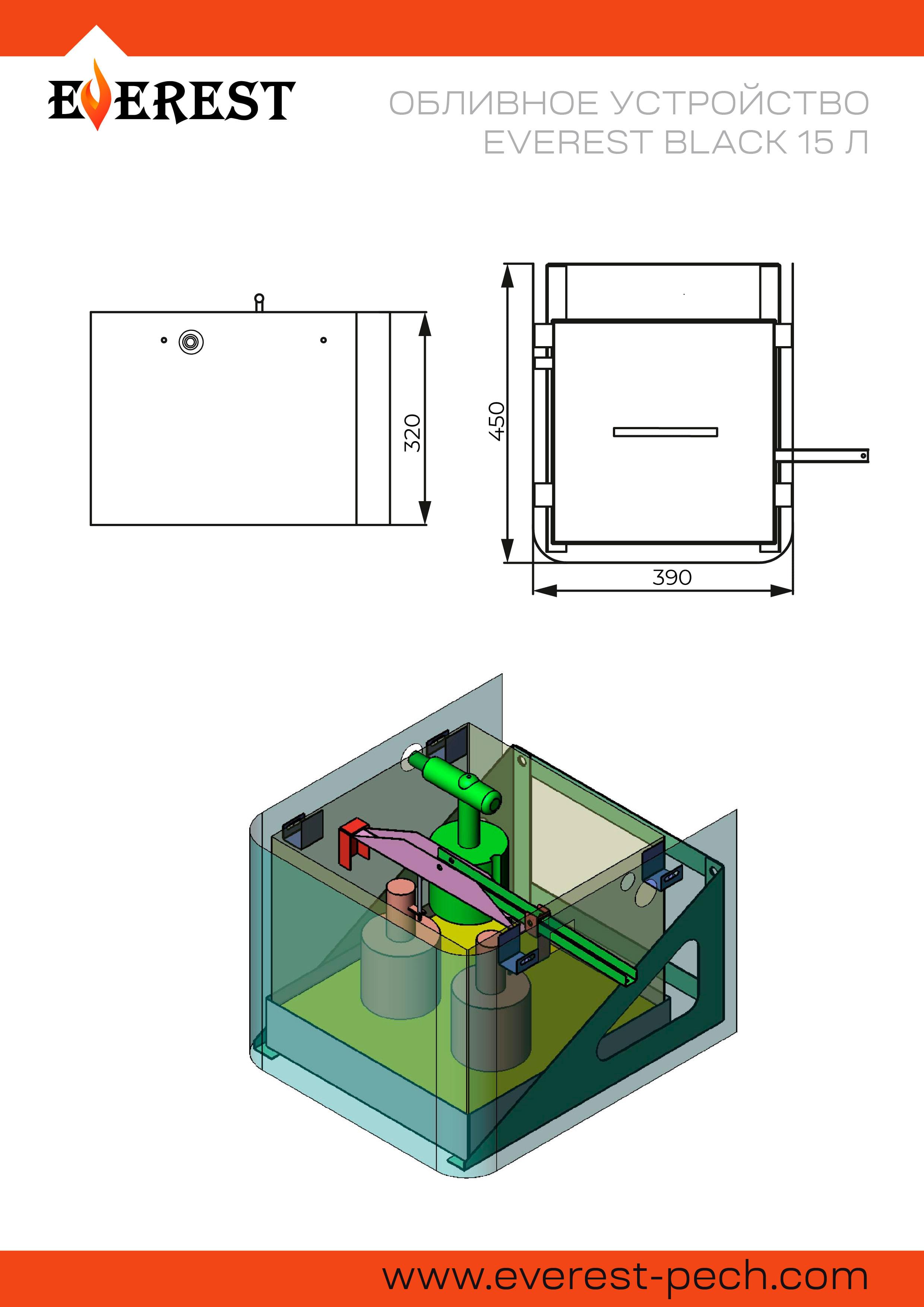 Обливное устройство ЭВЕРЕСТ представляет собой бак из нержавеющей стали, автоматически наполняемый водой. Количество воды в баке регулируется с помощью клапана подачи воды. Максимальный объём воды в баке – 15 литров.Бак обливного устройства устанавливается на высоте 2-2,2 метра. Вода для облива после парилки подаётся с помощью рукоятки на цепи. Широкое основание бака с большим количеством мелких отверстий обеспечивает оптимальный по размеру и интенсивности поток воды.Равномерная подача большого объёма воды обеспечена за счёт трех выпускных клапанов, одновременно открывающихся при потягивании рукоятки вниз.