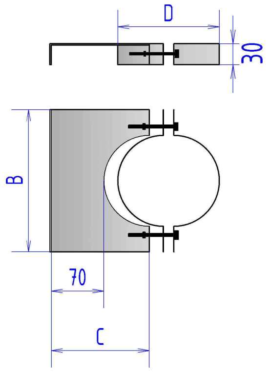 Крепление к стене КС – элемент, поддерживающий дымоход в заданном при монтаже положении и обеспечивающий устойчивость при боковых нагрузках. Служит в большей степени для удержания элементов дымохода в вертикальном положении. Не является силовым элементом. Состоит из опорной пластины с монтажными отверстиями для крепления к стене и разборного ленточного хомута, состоящего из двух радиусных элементов с монтажными отверстиями, и болтов с гайками. Опорная пластина жестко закрепляется на стене из негорючего материала. Ленточный хомут охватывает элемент дымохода по наружному диаметру и затягивается посредством болтов и гаек. Передвигая парные гайки, можно смещать дымоход в горизонтальном направлении.