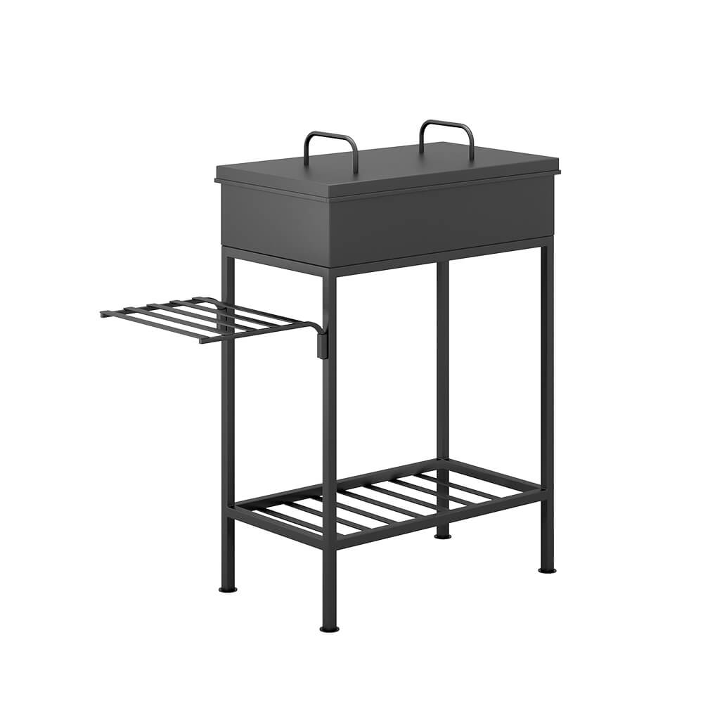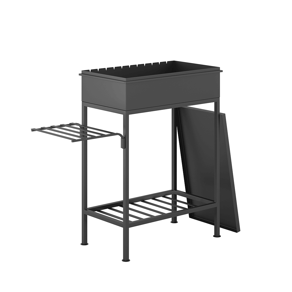 Для удобства применения мангал оборудован полкой в нижней части мангала. На этой полке можно хранить дрова или инструменты для ухода за мангалом. Боковая решётчатая полка — съёмная, предназначена для размещения посуды.