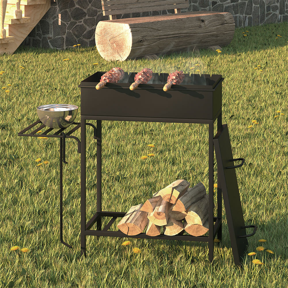 Коробка мангала по верхнему краю обварена металлическим прутком, предотвращающим деформацию стенок при нагреве. Вырезы для шампуров находятся с одной стороны коробки.