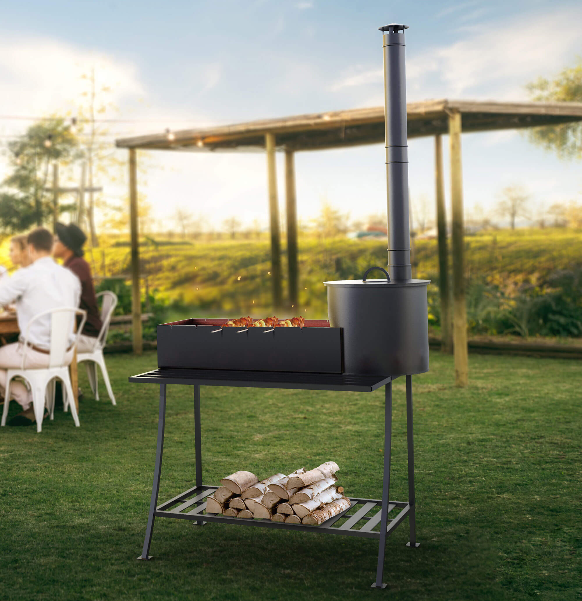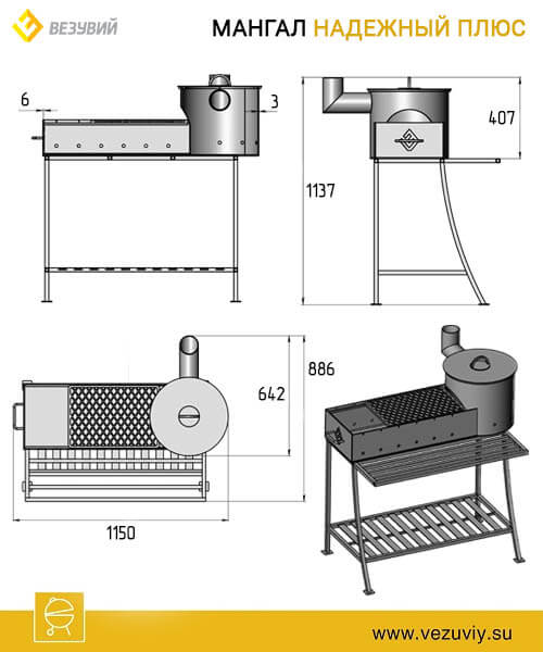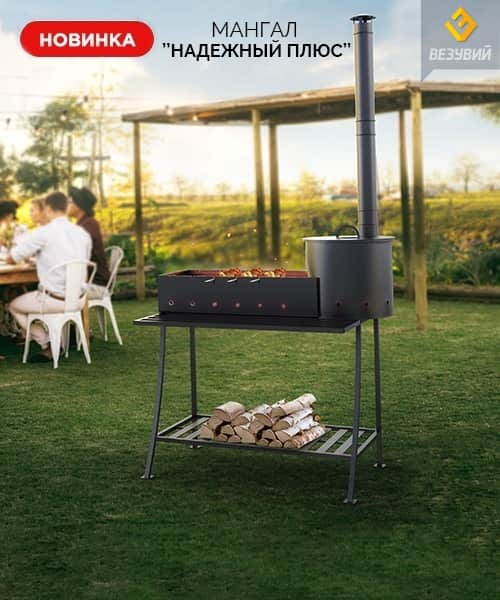 Мангал "Надежный Плюс" получил свое название из-за того, что произведен из 6мм котловой стали, покрытый термостойкой кремнийорганической эмалью, также особенностью мангала является печь под казан с высокой вытяжной трубой самоварного типа. На мангале можно одновременно готовить пищу на шампурах и в казане. Так как мангал стационарный для защиты от осадков в комплекте поставляется крышка для мангальной вставки и печи под казан.