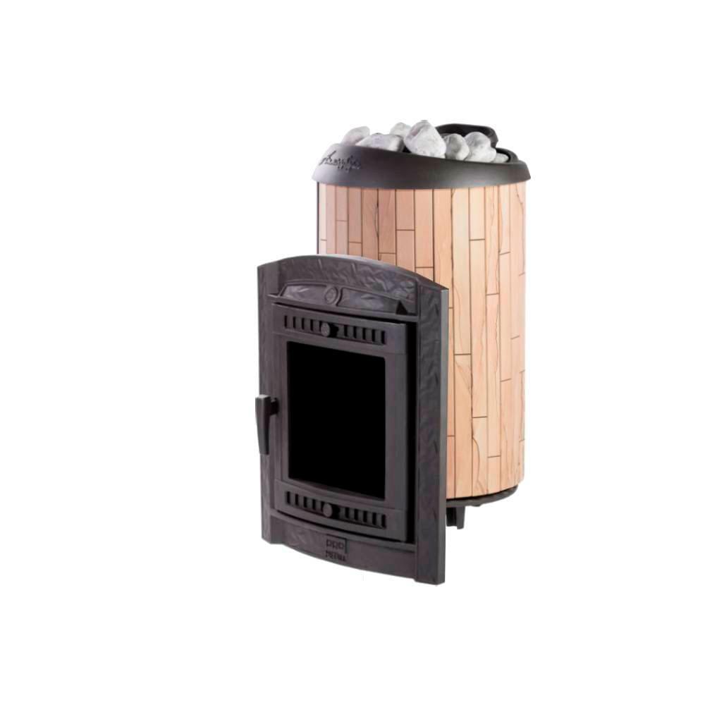 Чугунная печь для бани на дровах «Атмосфера L КТТ» в облицовке ламели из натурального камня «Окаменевшее дерево» наборные, натурального теплоемкого материала, который помимо эстетики способствует созданию приятной атмосферы с мягким комфортным теплом в бане.