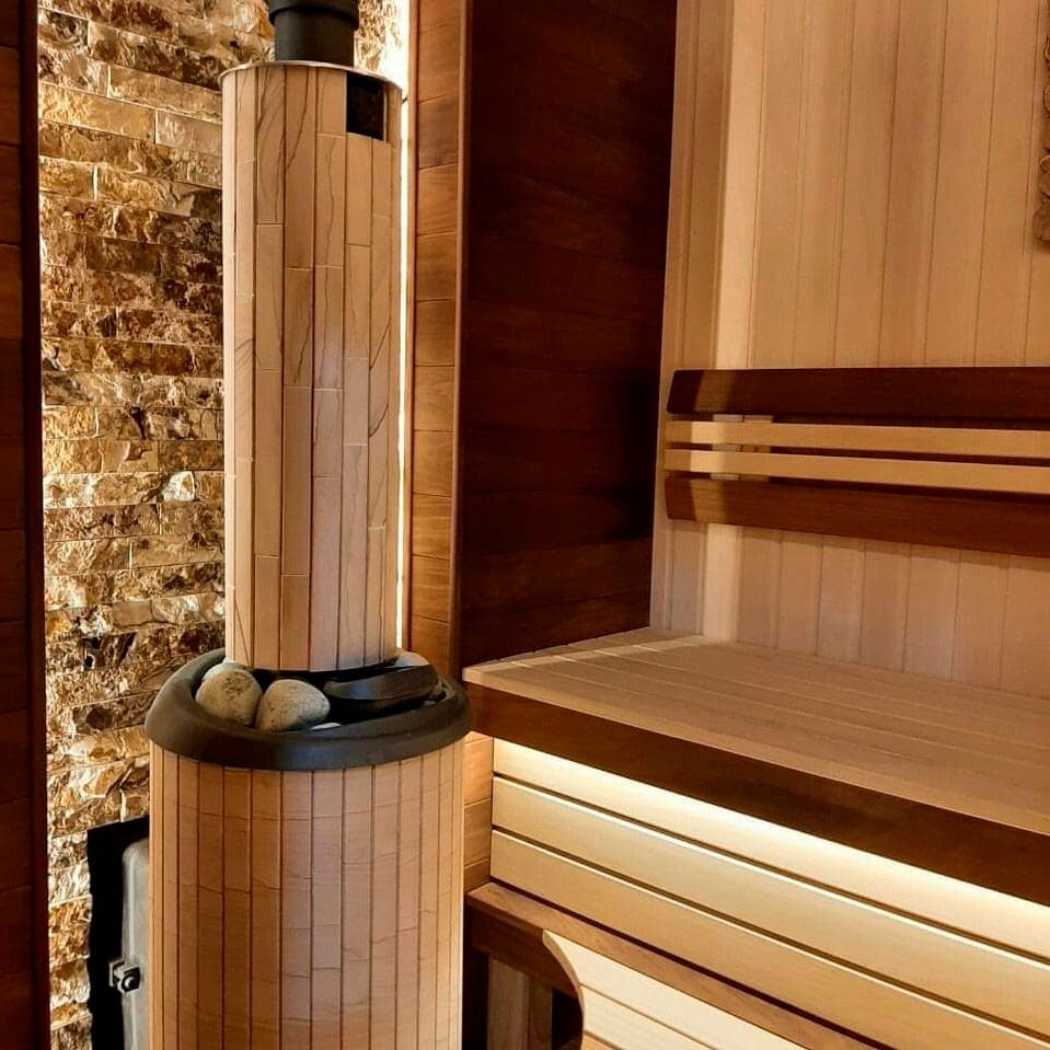 - Облицовка из натурального камня ламели «Окаменевшее дерево» повышает теплоемкость банной печи и обеспечивает мягкое комфортное тепло в парильном помещении бани.