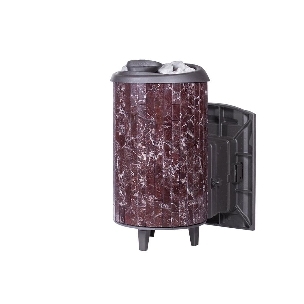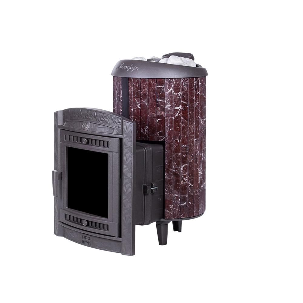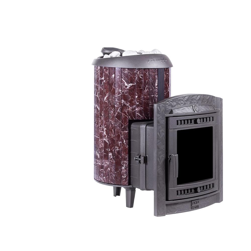 Чугунная печь для бани на дровах «Атмосфера L+» в облицовке ламели из натурального камня «Россо Леванто», натурального теплоемкого материала, который помимо эстетики способствует созданию приятной атмосферы с мягким комфортным теплом в бане.