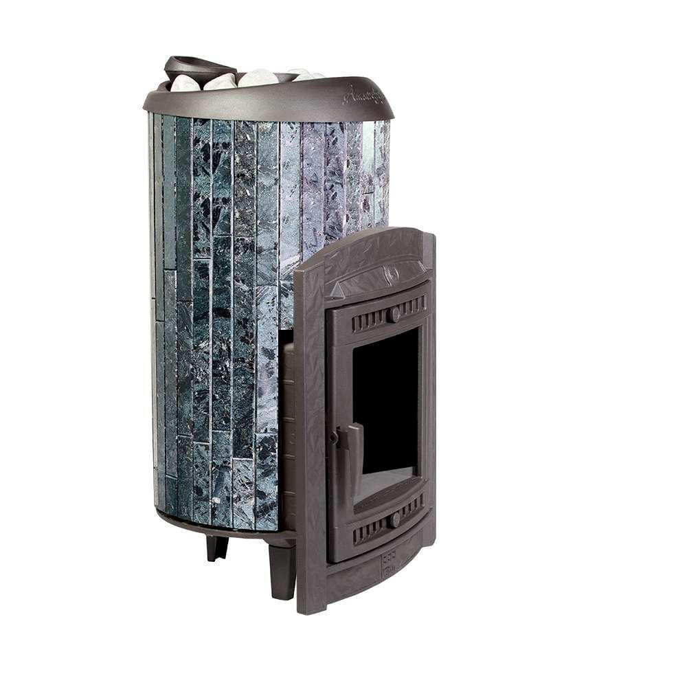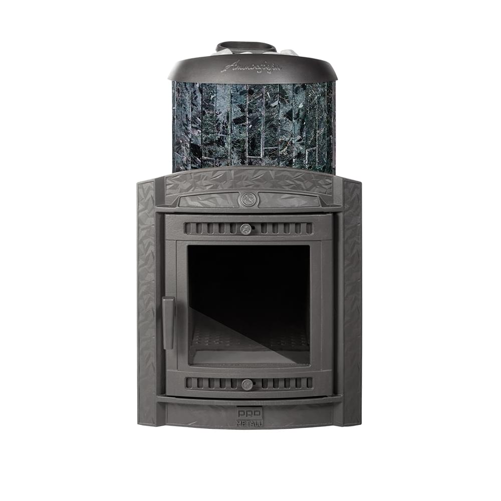 Модель с увеличенной усиленной каменкой и повышенной производительностью с коротким топливным тоннелем. Ламели из пироксенита по периметру внешней каменки не только обладают хорошими теплонакопительными свойствами, но и придают печи оригинальный внешний вид