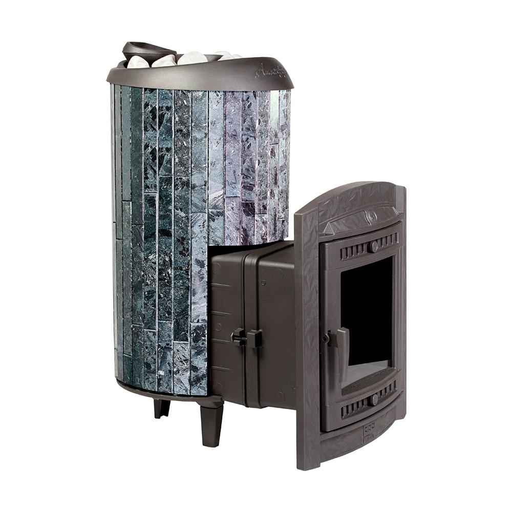 Дровяная банная печь с чугунной топкой «Атмосфера XL+» в облицовке ламели из натурального камня «Пироксенит» наборный, натурального теплоемкого материала, который помимо эстетики способствует созданию приятной атмосферы с мягким комфортным теплом в бане.