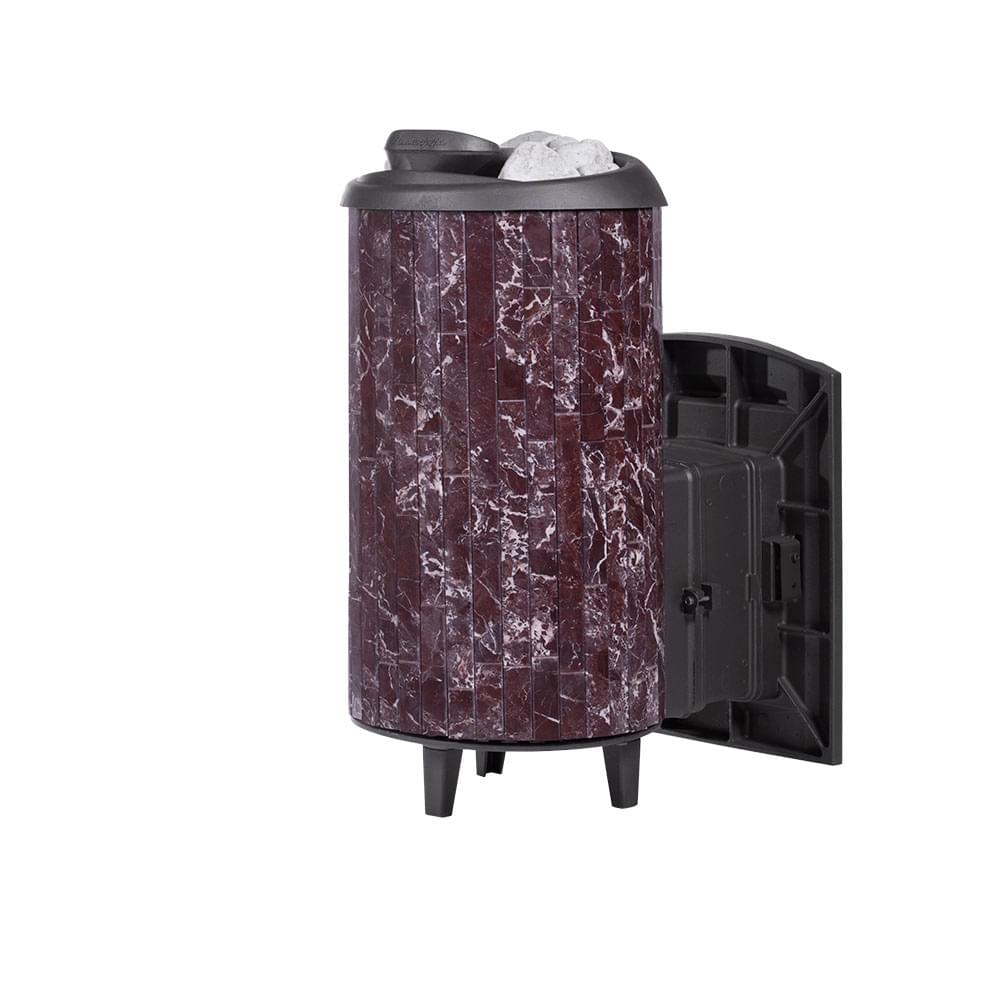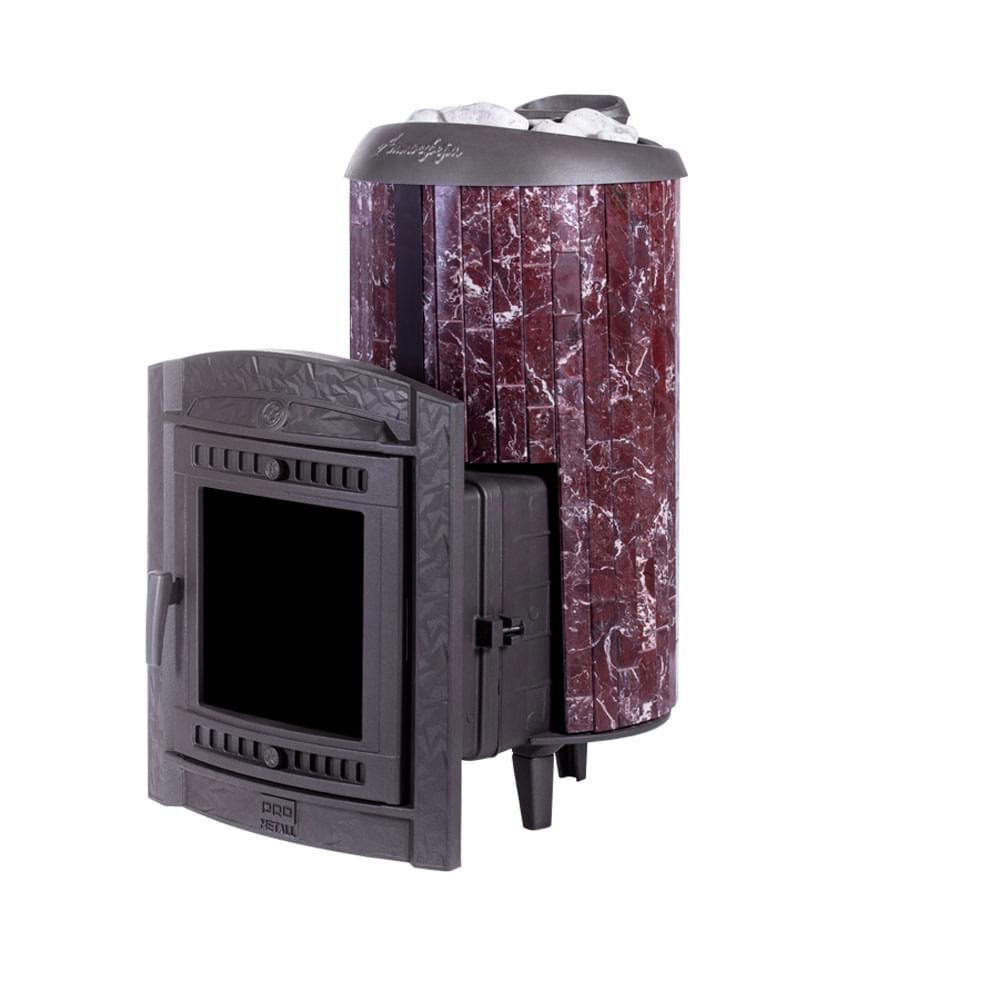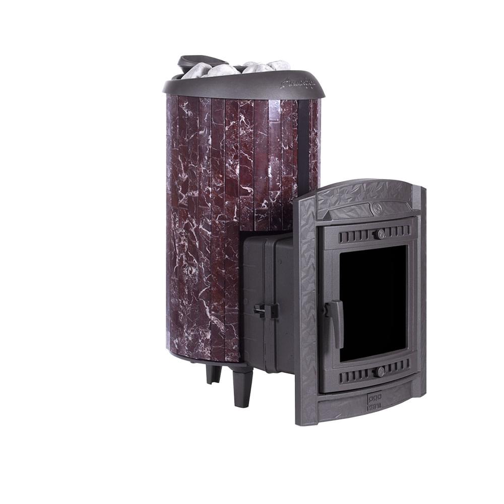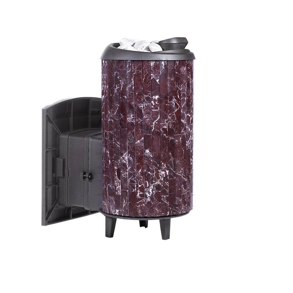 Чугунная печь для бани «Атмосфера XL+» в облицовке ламели из натурального камня «Россо Леванто», натурального теплоемкого материала, который помимо эстетики способствует созданию приятной атмосферы с мягким комфортным теплом в бане.