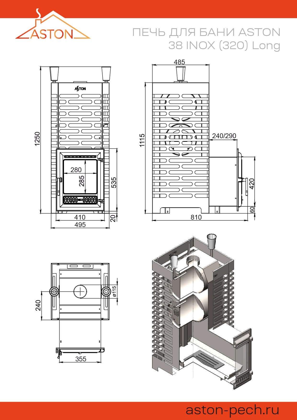 Дровяная печь для бани из нержавеющей стали ASTON 38 INOX (320) Long со стеклом, с открытой и закрытой каменкой на 40 кг. камней и сеткой конвектором от 190 до 230 кг. камней, с топочным выносом длиной 240/290 мм, для бани с парной до 40 м3.