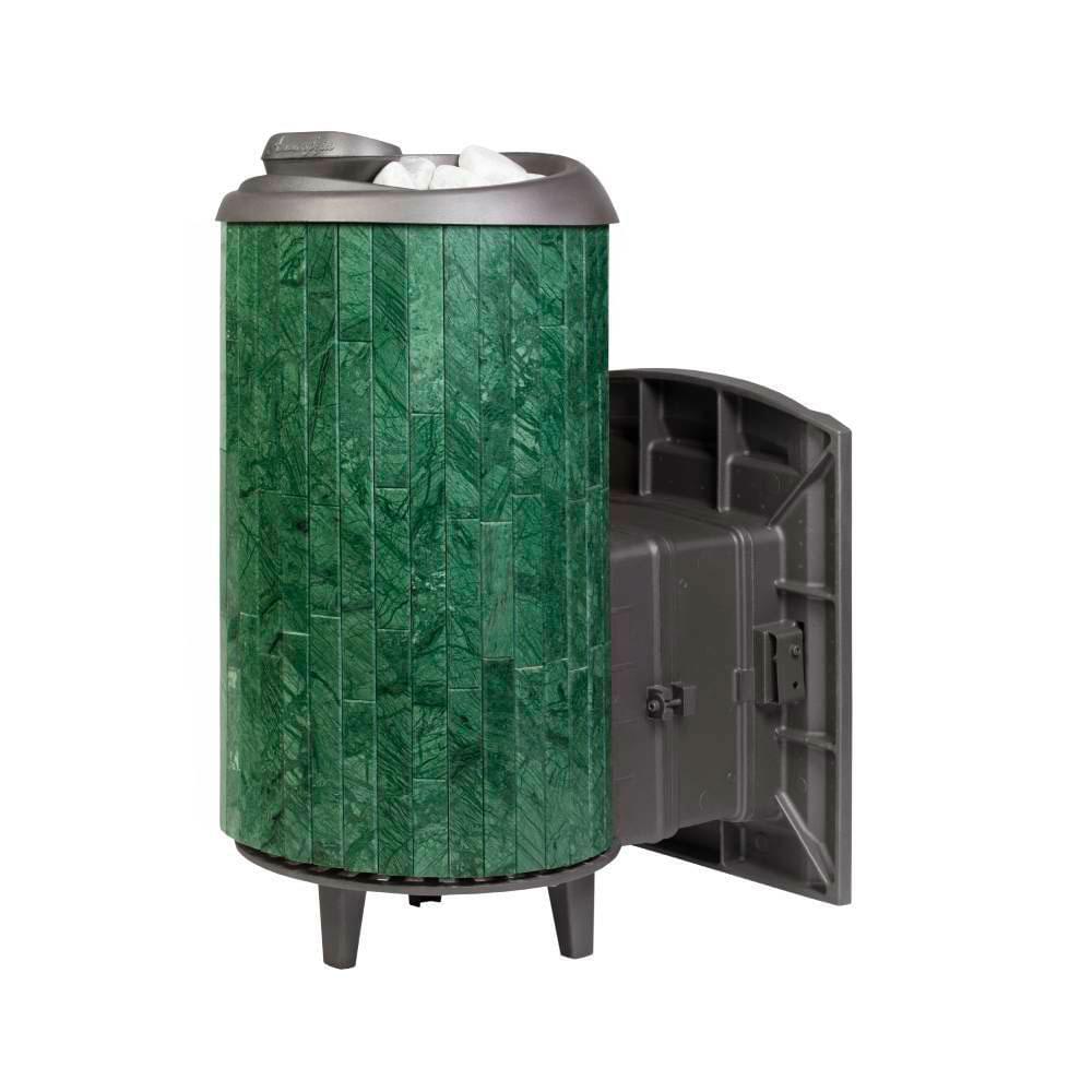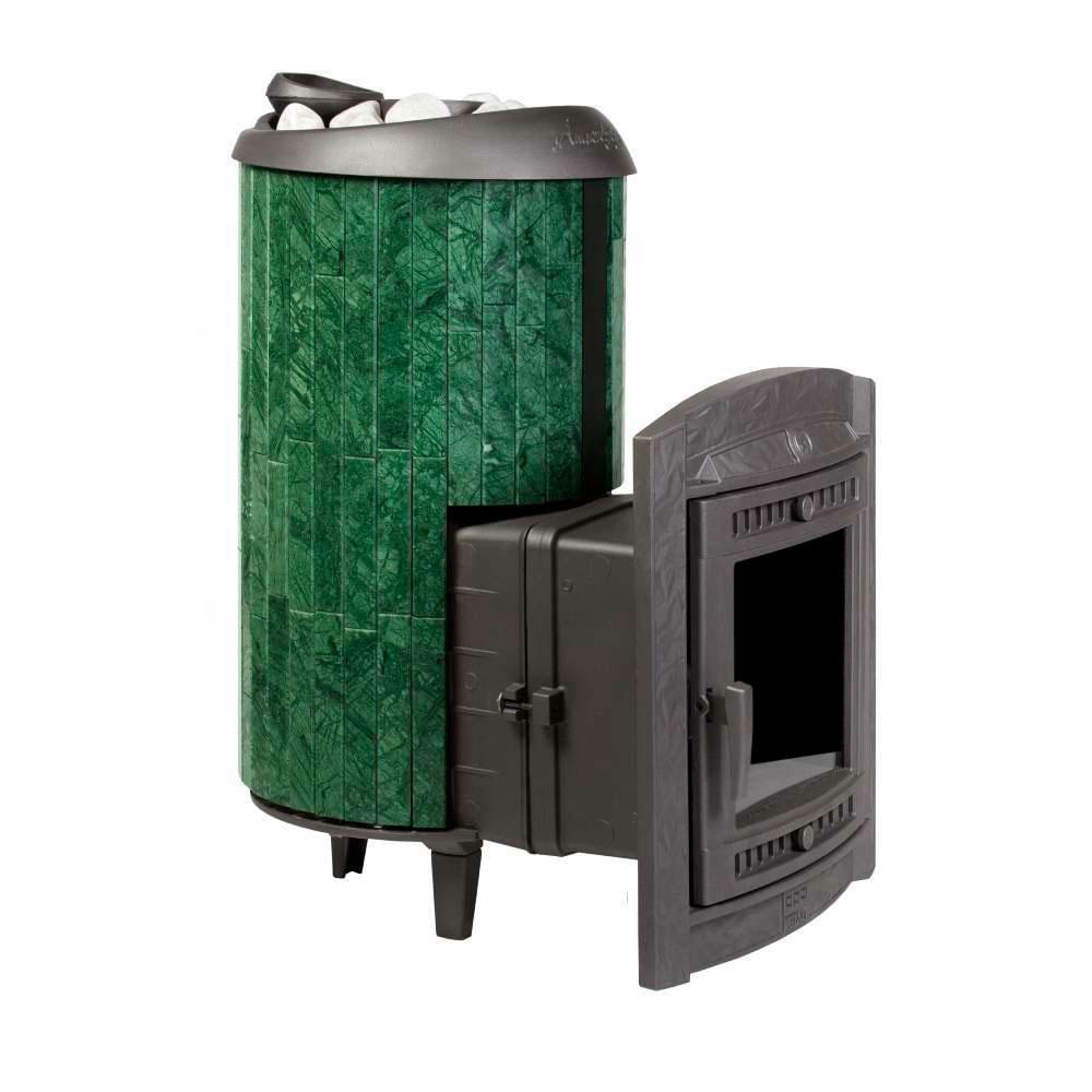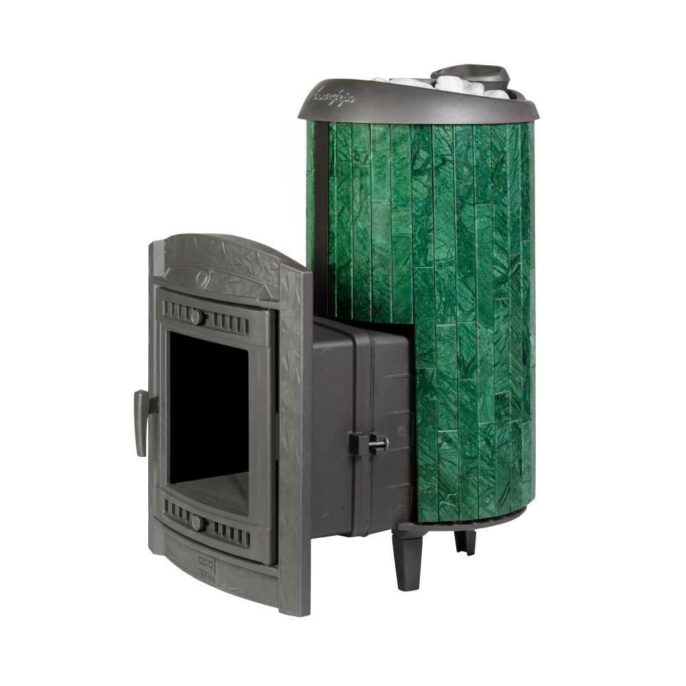 Чугунная печь для бани на дровах «Атмосфера XL» в облицовке ламели из натурального камня «Верде Гватемала» с наборным рисунком, натурального теплоемкого материала, который помимо эстетики способствует созданию приятной атмосферы с мягким комфортным теплом в бане.