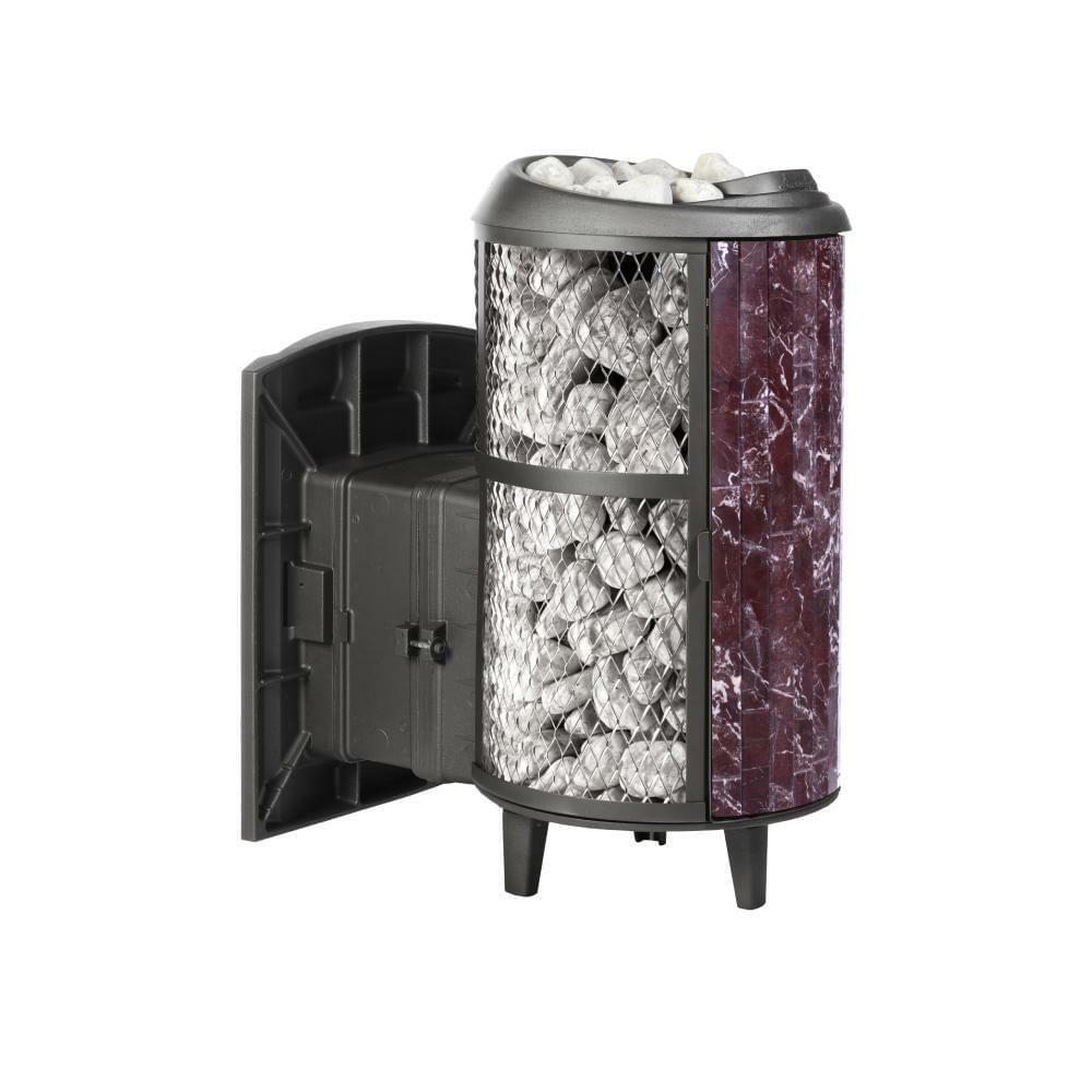 Дровяная банная печь с чугунной топкой «Атмосфера L» с комбинированной облицовкой «Россо Леванто», модель с комбинированной облицовкой из нержавеющей сетки и ламелей. Особенность модели - открывающаяся дверь с ламелями. Это оригинальное решение обеспечивает быстрый прогрев парной.