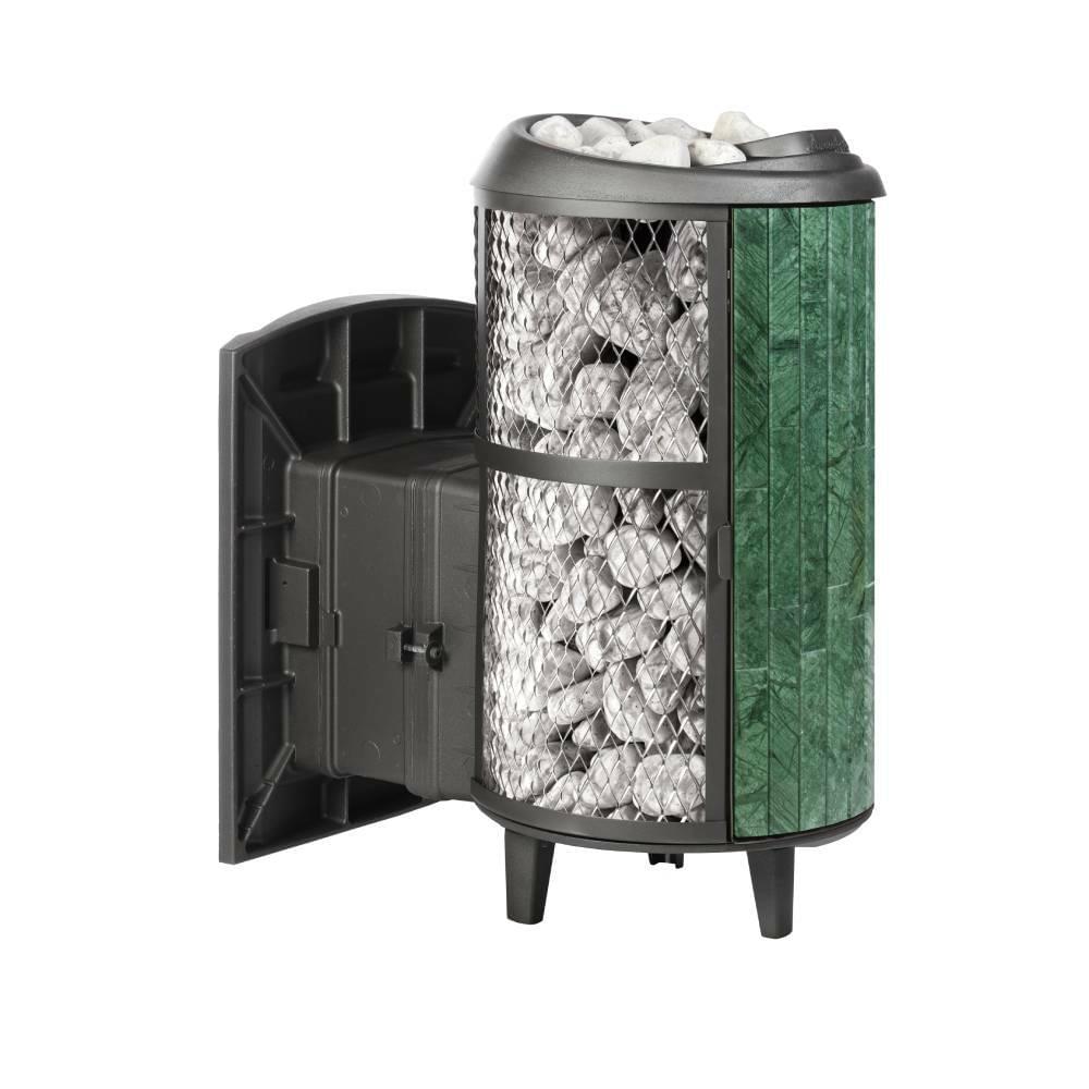 Чугунная печь для бани на дровах «Атмосфера L» с комбинированной облицовкой «Верде Гватемала», модель с комбинированной облицовкой из нержавеющей сетки и ламелей. Особенность модели - открывающаяся дверь с ламелями. Это оригинальное решение обеспечивает быстрый прогрев парной.