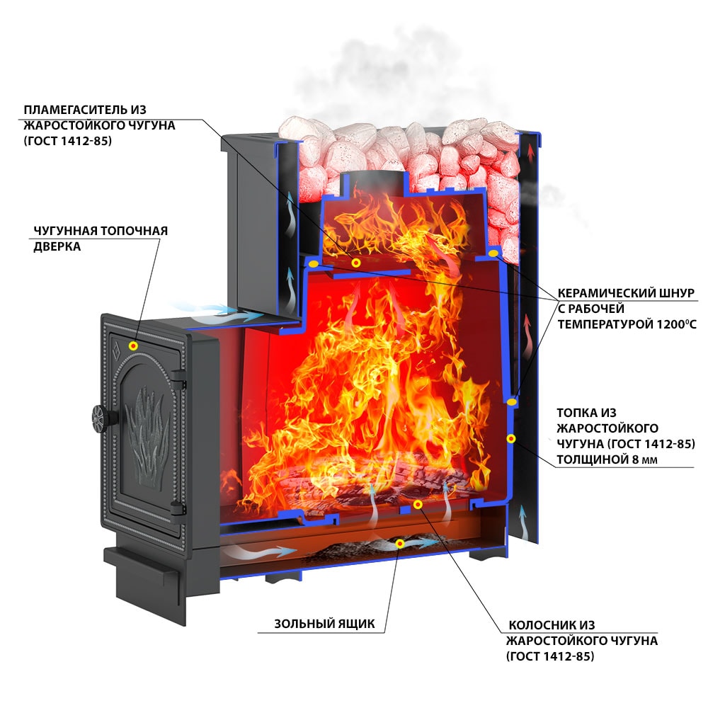 Преимущество печи в том, что топка печи состоит из 3-х элементов. На стыке между ними используется керамический шнур с рабочей температурой 1200 градусов. То есть топка печи абсолютно герметична! Для фиксации деталей между собой применяется болтовое соединение, что даёт 100% гарантию безопасности при эксплуатации.