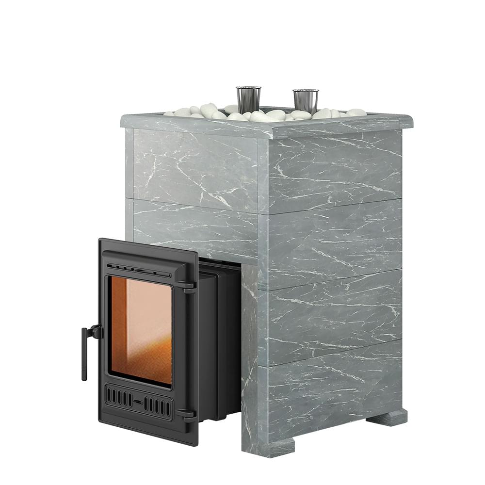 Банная печь на дровах Эверест "Steam Master 30 ЧУГУН" со стеклом, в облицовке Талькохлорит, S-40, рассчитана на отопление бани объемом от 16 до 30 м3.