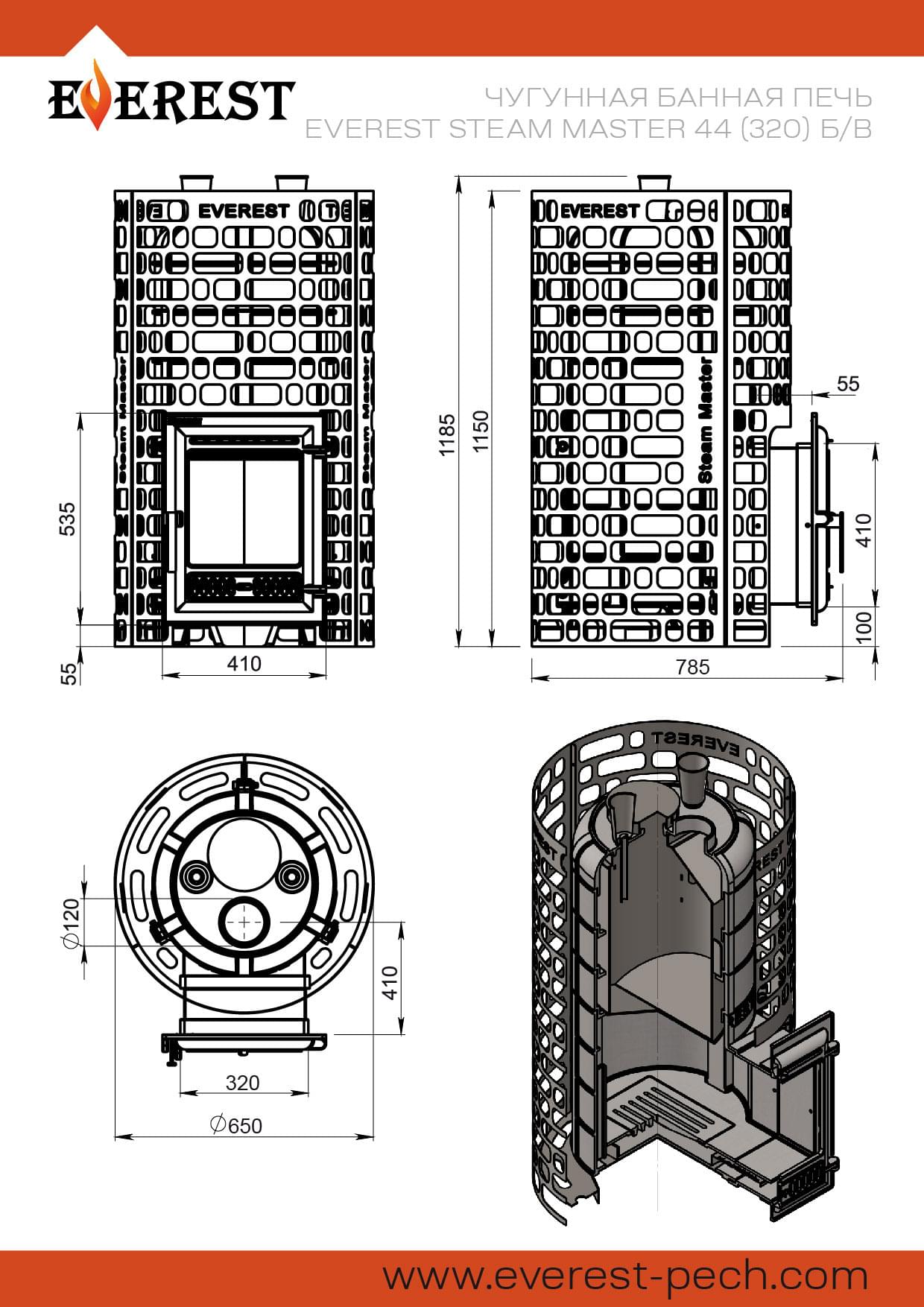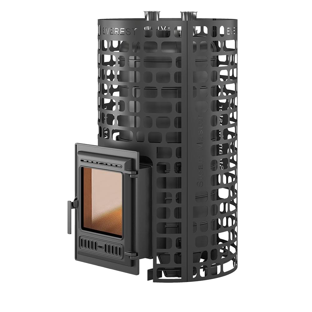 Чугунная дровяная банная печь Эверест "Steam Master" 44 (320) ЧУГУН б/в, без топочного выноса, с открытой и закрытой каменками, с сеткой для камней Антрацит на 210 кг + 65 кг в закрытой каменке, отапливаемы объем парной от 24 до 44 м3.
