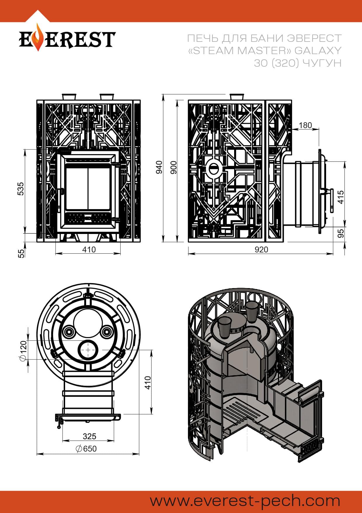 Чугунная печь для бани на дровах Эверест "Steam Master" GALAXY 30 (320) ЧУГУН GOLD, с топочным выносом, с открытой и закрытой каменками, с сеткой для камней GALAXY GOLD на 140 кг + 25 кг в закрытой каменке, объем парного помещения от 16 до 30 м3.
