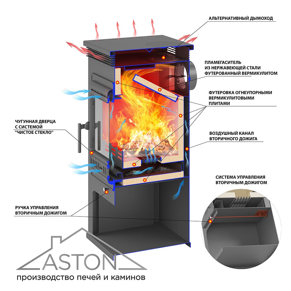 Топка камина изнутри футерована вермикулитовыми плитами, которые защищают боковые стенки и дно топки от тепловой нагрузки. Во время топки вермикулит накапливает большое количество тепла, которое он постепенно отдаёт в окружающее пространство. Это позволяет печи-камину АСТОН дольше оставаться тёплым и поддерживать комфортную температуру вокруг.