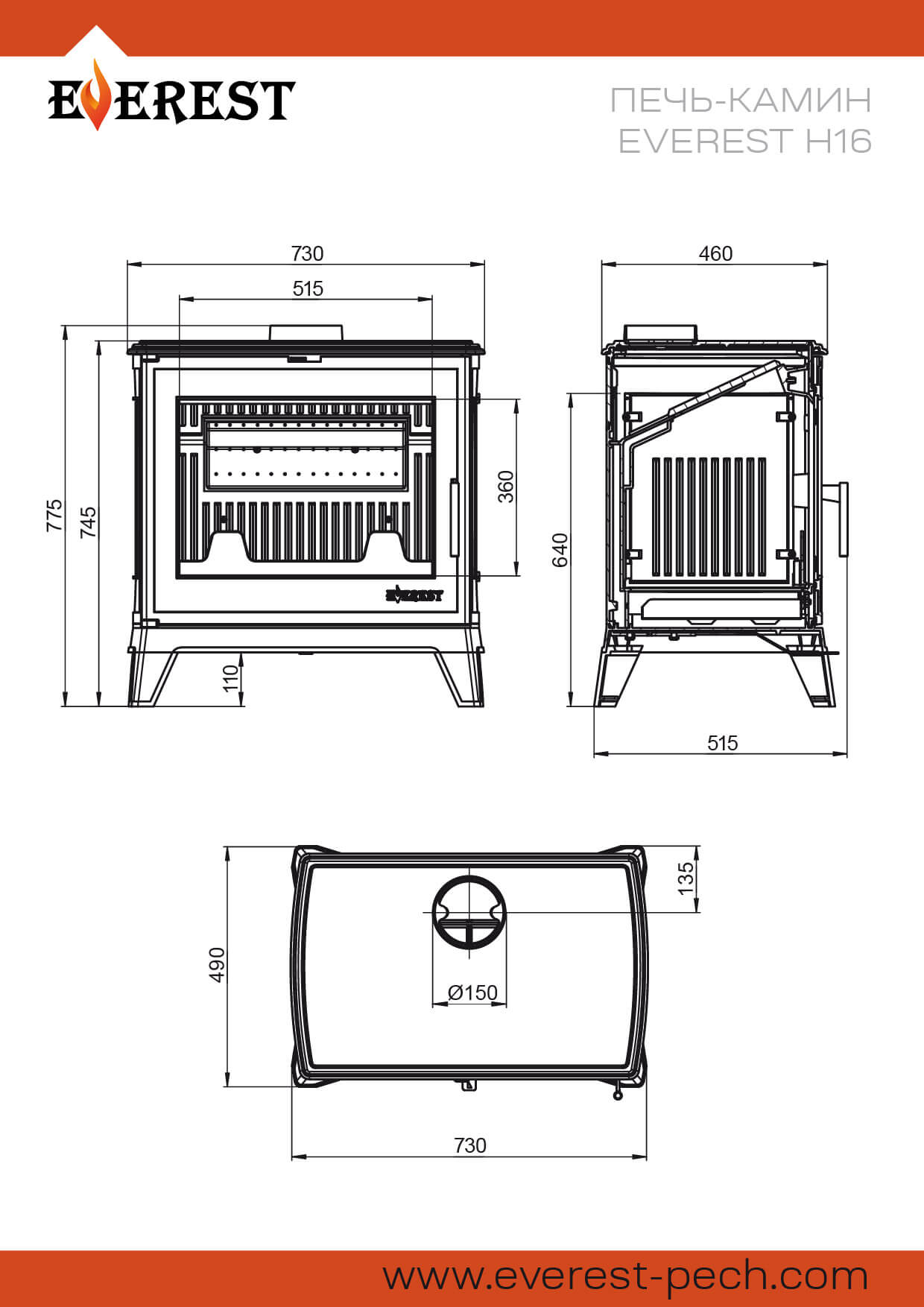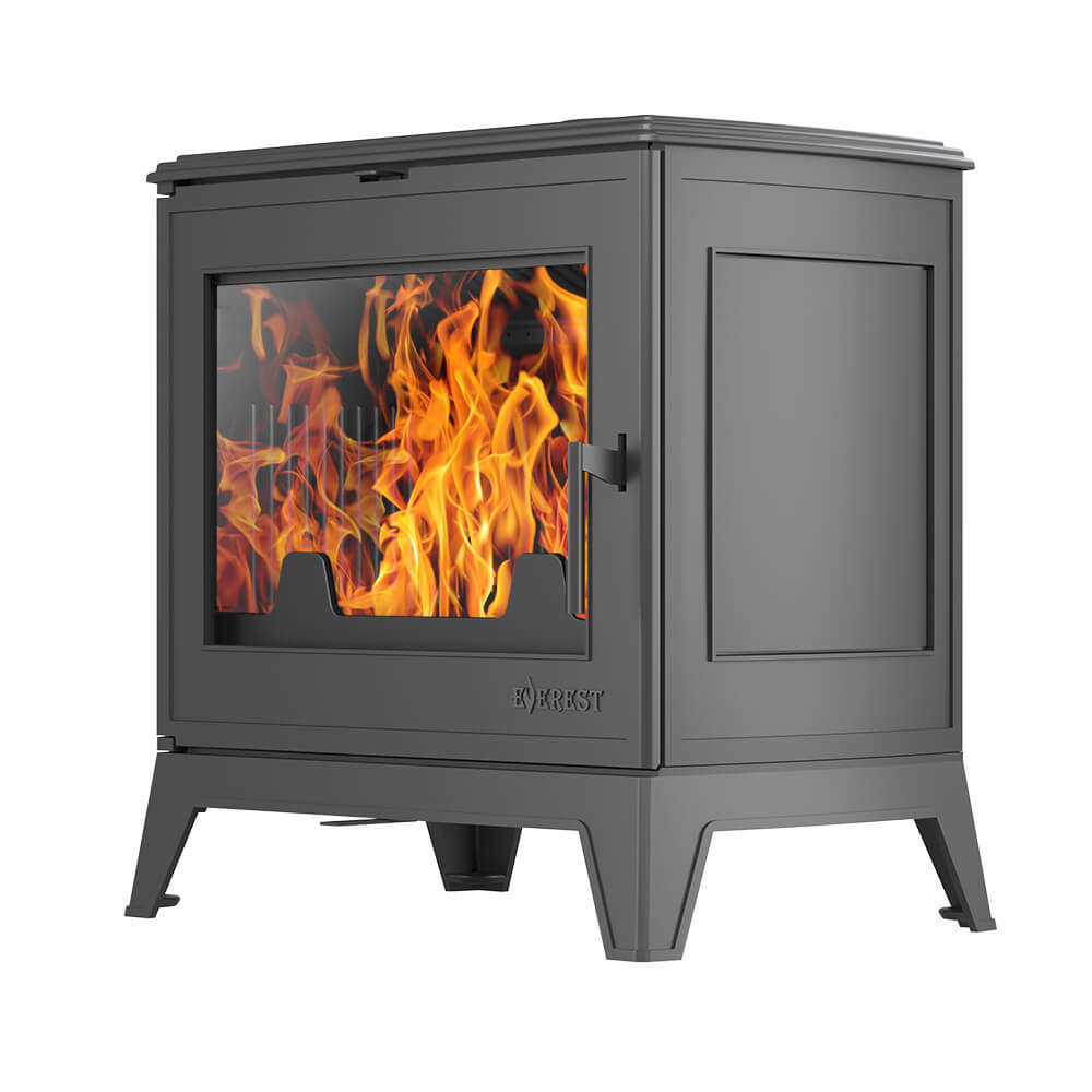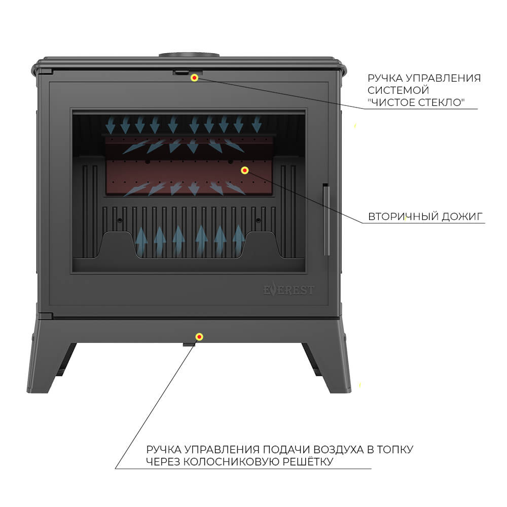 Печь-камин EVEREST Н16 – чугунная печь длительного горения для отопления дома объемом до 320 м3. Печь с усиленной топкой с многоуровневым дожигом, отопительная мощность печи 16 кВт.