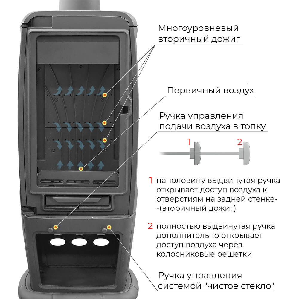 Печь-камин имеет два чугунных пламегасителя, обеспечивающие высокий КПД печи. Топка печи-камина усилена чугунными вставками с системой четырехуровневого вторичного дожига. С помощью этой функции по каналам подачи вторичного воздуха поступает воздух, который нагревается при прохождении между топочной камерой и стенками корпуса. Далее нагретый воздух через дефлектор поступает в топку, перемешивается с газами - продуктами горения, чем вызывает повторное возгорание. Регулировка этой системы, как и подача воздуха в колосниковую зону осуществляется рычагом, расположенным слева в нижней части печи-камина. В правой нижней части расположена ручка регулировки системы чистое стекло, которая препятствует оседанию сажи на внутреннюю поверхность стекла.