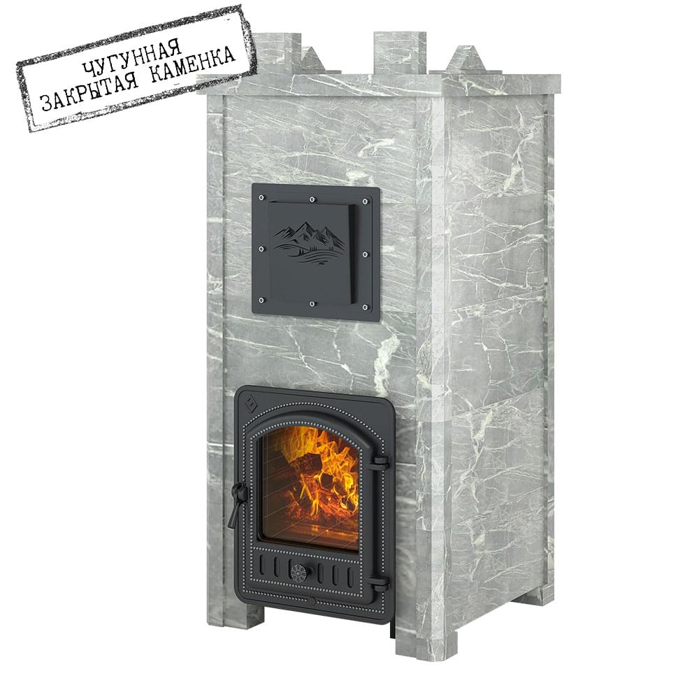 Закрытая каменка из чугуна толщиной 10 миллиметров сверху и снизу имеет закруглённую конструкцию. Каменка находится на месте пламегасителя. Огонь при горении дров охватывает каменку с четырёх сторон, что ускоряет нагрев заклада. Закрытая каменка рассчитана на размещение 60 килограммов камня для бани, создаёт массивный тепловой заряд. Каменка и внешний корпус изготовлены из чугуна, крепятся друг к другу по типу «паз-гребень» с использованием термостойкого герметика.