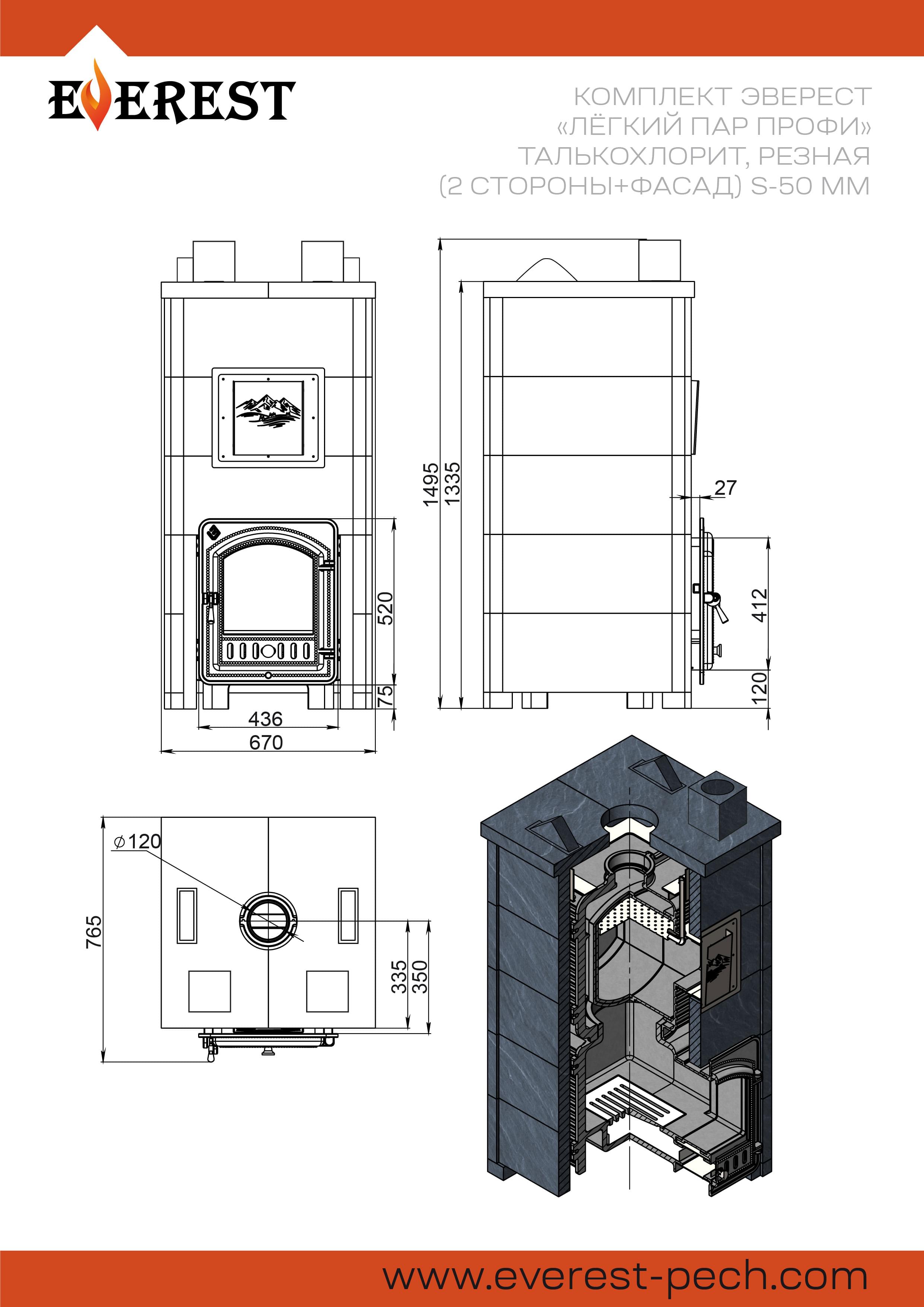 Печь Эверест "Легкий пар Профи" каменка из нерж. стали, Талькохлорит, S-50 мм, Б/В, Резная (2 стор.+фасад)