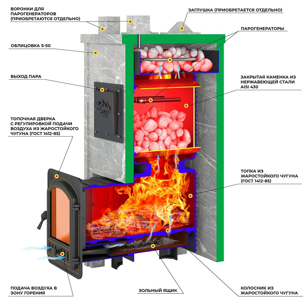Печь состоит из двух модулей: топочной камеры и закрытой каменки из чугуна. Наиболее термонагруженные участки печи сделаны из жаропрочного чугуна толщиной 20 миллиметров.