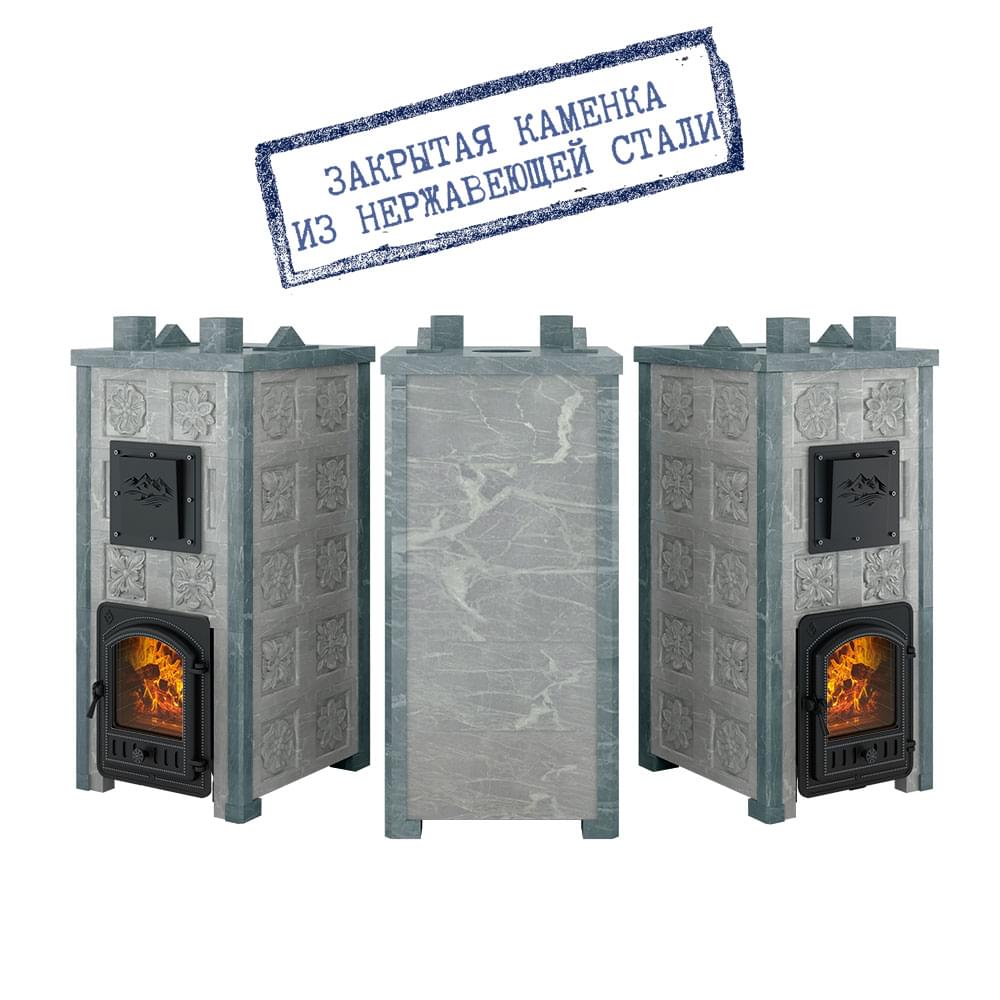 Закрытая каменка из Нержавеющей 4мм стали (AISI 430) сверху и снизу имеет закруглённую конструкцию. Каменка находится на месте пламегасителя. Огонь при горении дров охватывает каменку с четырёх сторон, что ускоряет нагрев заклада. Закрытая каменка рассчитана на размещение 60 килограммов камня для бани, создаёт массивный тепловой заряд. Каменка и внешний корпус изготовлены из чугуна, крепятся друг к другу по типу «паз-гребень» с использованием термостойкого герметика.