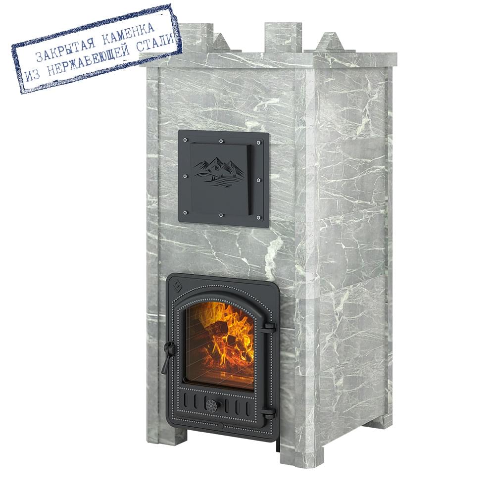 Закрытая каменка из чугуна толщиной 10 миллиметров сверху и снизу имеет закруглённую конструкцию. Каменка находится на месте пламегасителя. Огонь при горении дров охватывает каменку с четырёх сторон, что ускоряет нагрев заклада. Закрытая каменка рассчитана на размещение 60 килограммов камня для бани, создаёт массивный тепловой заряд. Каменка и внешний корпус изготовлены из чугуна, крепятся друг к другу по типу «паз-гребень» с использованием термостойкого герметика.