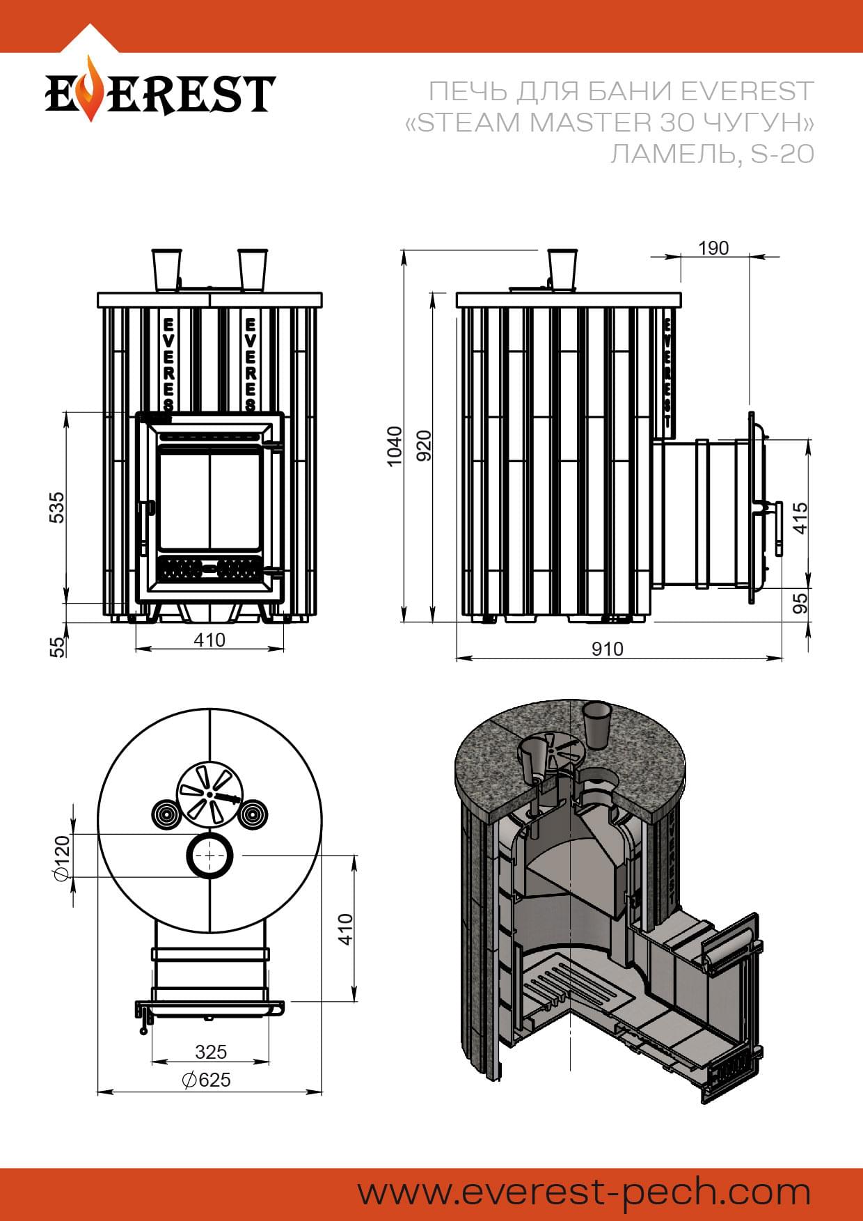 Банная печь Эверест "Steam Master 30 ЧУГУН" Ламель Амфиболит, S-20 предназначена для нагрева помещений и получения пара в парных объёмом до 30 м³. Печь изготовлена из качественного чугуна и отличается интересной конструкцией.