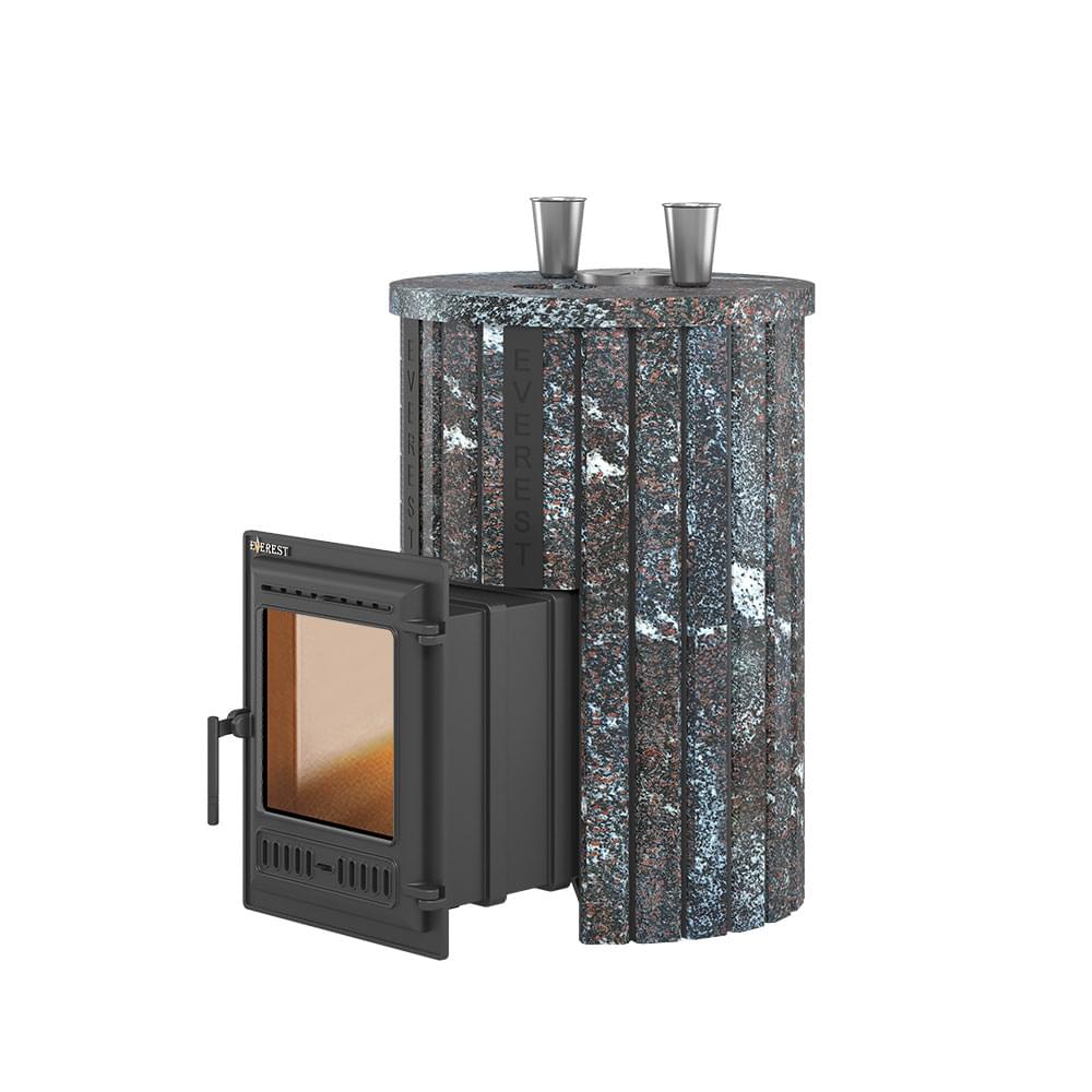 Топочная камера печи – сборная, состоит из трёх деталей, соединяемых между собой на болтах. Вертикальные швы по краю деталей соединяются по принципу паз-гребень, что обеспечивает высокую герметичность топки и минимальную деформацию даже при длительном нагреве. Соединение не требует применения уплотнителей шва, достаточно только герметика. Верхняя часть топки изготовлена из чугунных колец. В печи Эверест "Steam Master 30 ЧУГУН" Ламель Амфиболит, S-20 между топкой и крышкой размещено одно кольцо высотой 120 мм. Для полного сгорания топлива в топке устроены каналы вторичного дожига, подающие воздух из поддувала в верхние точки камеры, в места скопления разогретых газов.