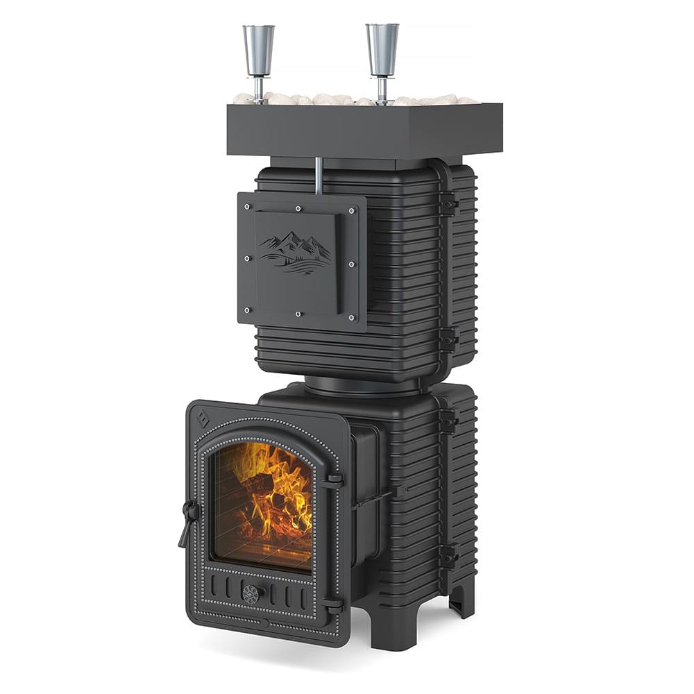 В качестве открытой каменки выше основной части печи размещён стальной поддон для камней, куда умещается более 60 кг камня. Совокупный вес печи и заклада составляет более 400 кг.