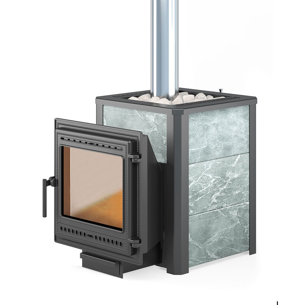 Чугунная дровяная печь для бани Печь ВЕЗУВИЙ Легенда 16 (505) в камне талькохлорит с открытой и каменкой, с конветором на 60 кг. камней, с топочным выносом, для парной объемом от 8 до 18 м3.