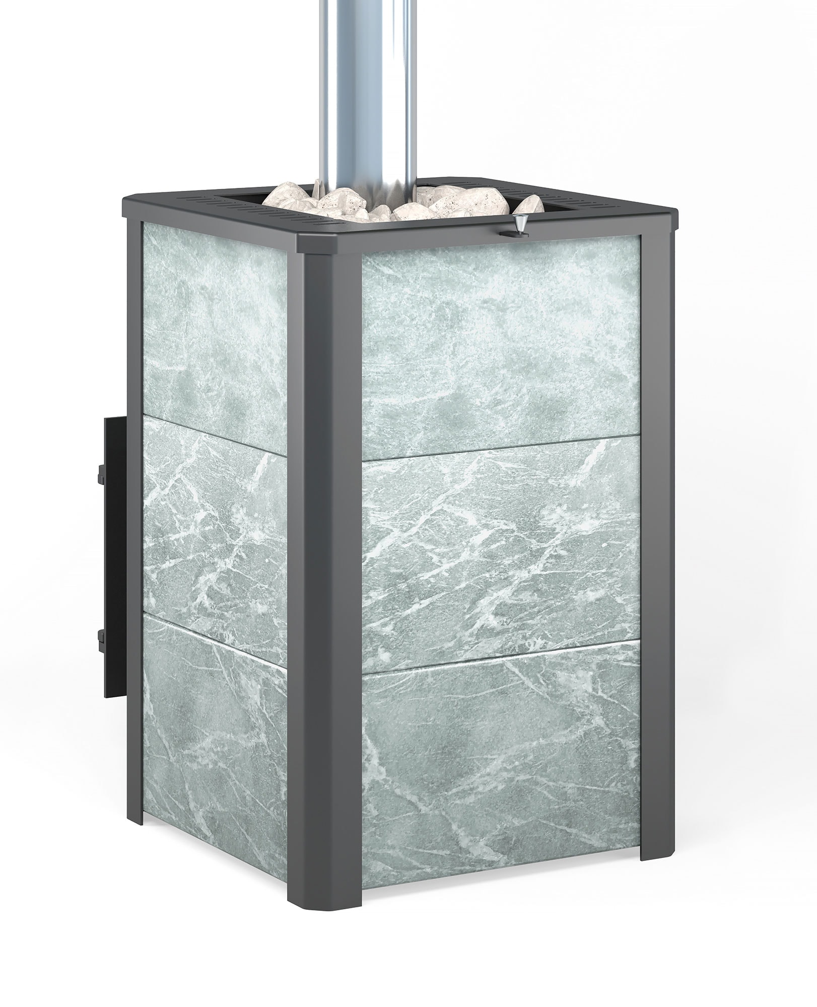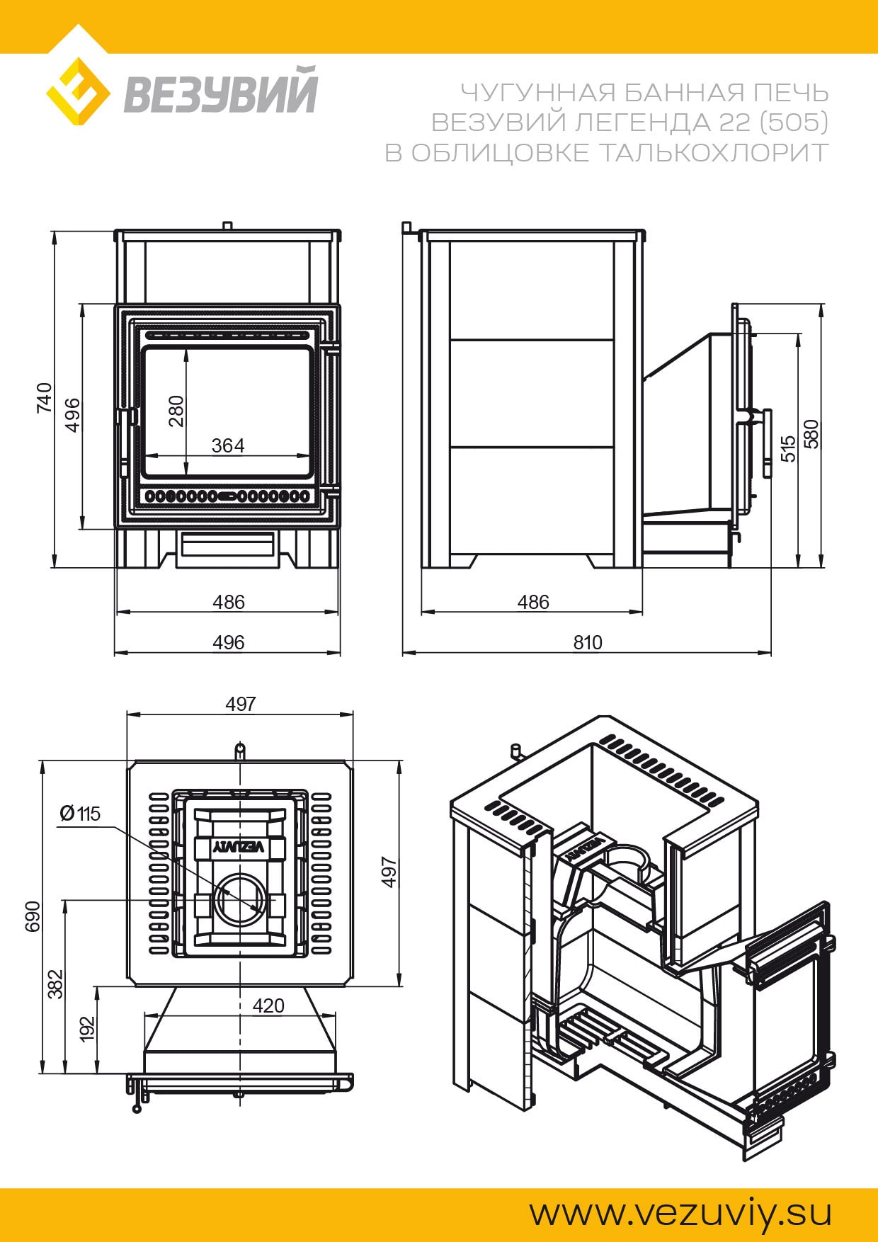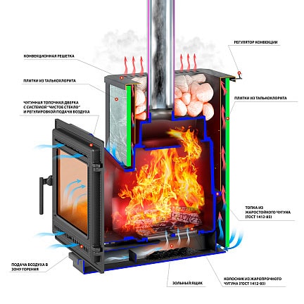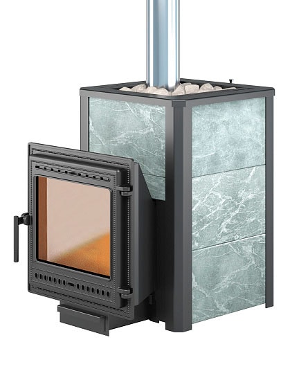 Конвекционно–вентилируемая облицовка, изготовленная из экологически чистой горной породы , который обладает большой теплоёмкостью, что позволяет камню в короткие сроки нагреваться и максимально долго удерживать стабильную температуру в парильном помещении, а также гасить жёсткое инфракрасное излучение Камень обладает исключительными лечебными свойствами: помогает при головных болях, при нестабильном артериальном давлении, при простудных заболеваниях, воспалительных процессах в почках и пищеварительной системе, снимает повышенную возбудимость и нервозность, сглаживает эмоциональные всплески. Облицовка из натурального камня при нагреве способна аккумулировать тепло, что гарантирует максимально равномерный прогрев и сохранение тепла Банная печь ЛЕГЕНДА 22 (505) укомплектован чугунной каминной, самоохлаждаемой дверцей Везувий 505 с большим жаропрочным стеклом «SCHOTT ROBAX», с оборудованной системой самоочистки, что позволяет визуально контролировать горение и любоваться видом живого огня. Данная печь рассчитана на объем парильного помещения 12-24 м3.