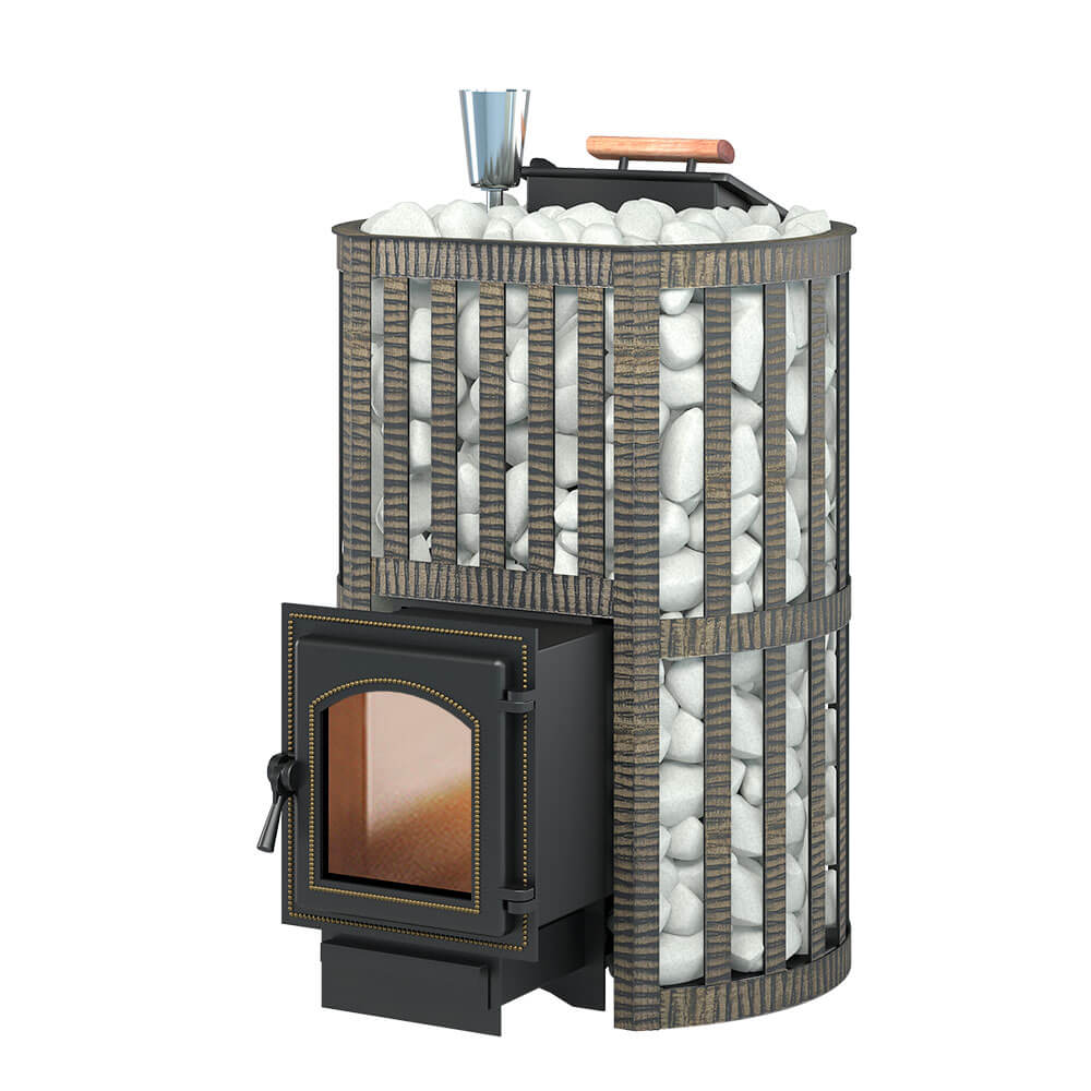 Банная чугунная печь Ураган Ковка 22 (270) укомплектована чугунной герметичной дверцей Везувий 270 с жаропрочным стеклом «SHOT ROBAX». Закрытая каменка изготовлена из стали и вмещает в себя не менее 60кг камней. Конвекционно-вентилируемый кожух "Ковка" изготовлен из металлической текстурированной полосы покрашенной термостойкой краской и покрытая патиной «Бронза».