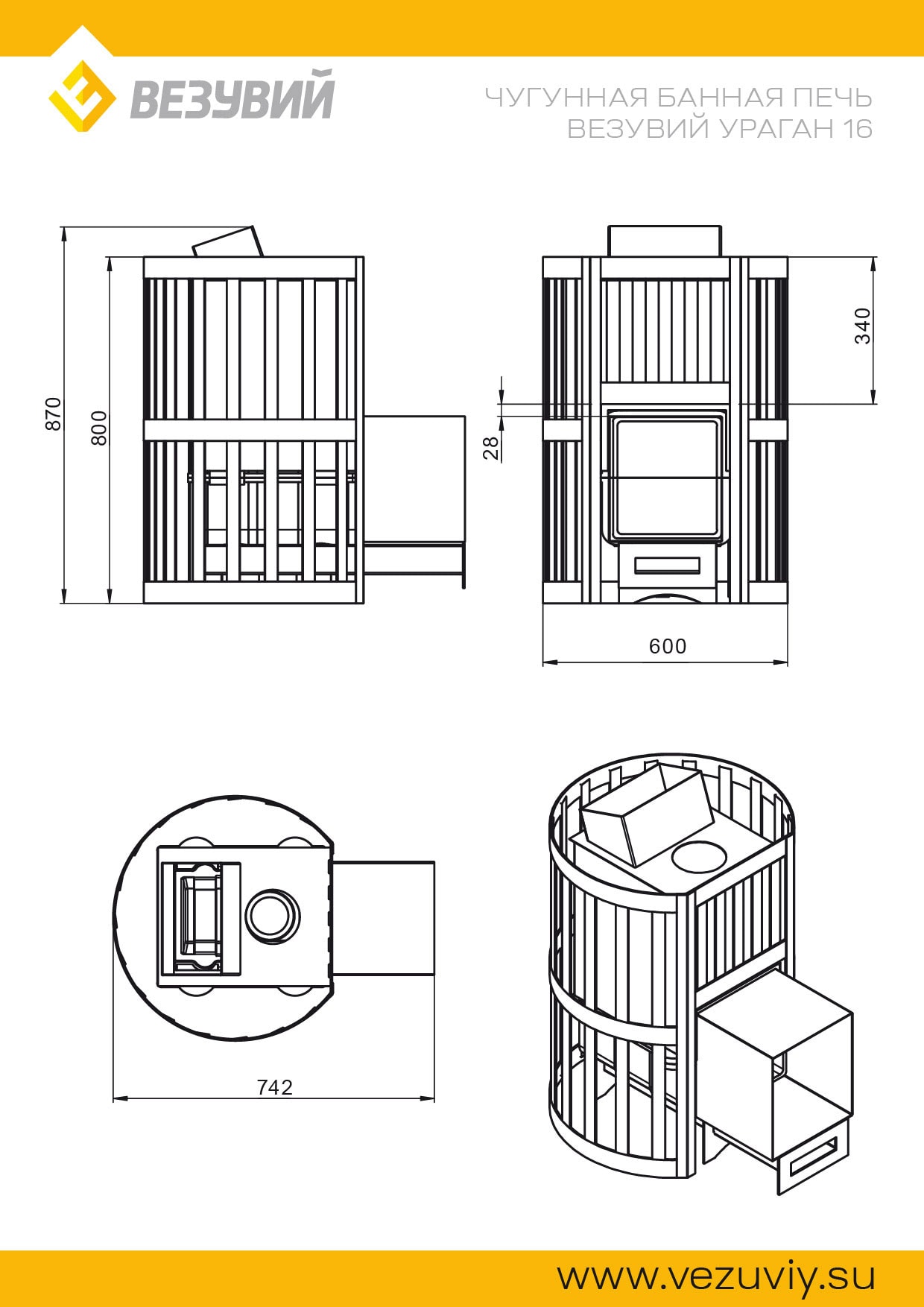 Чугунная печь для бани Везувий Ураган СТАНДАРТ 16 (ДТ-4) со сплошной чугунной топочной дверцей Везувий ДТ-4, расчитана на обогрев парильного помещения объемом 8 до 18 м³.