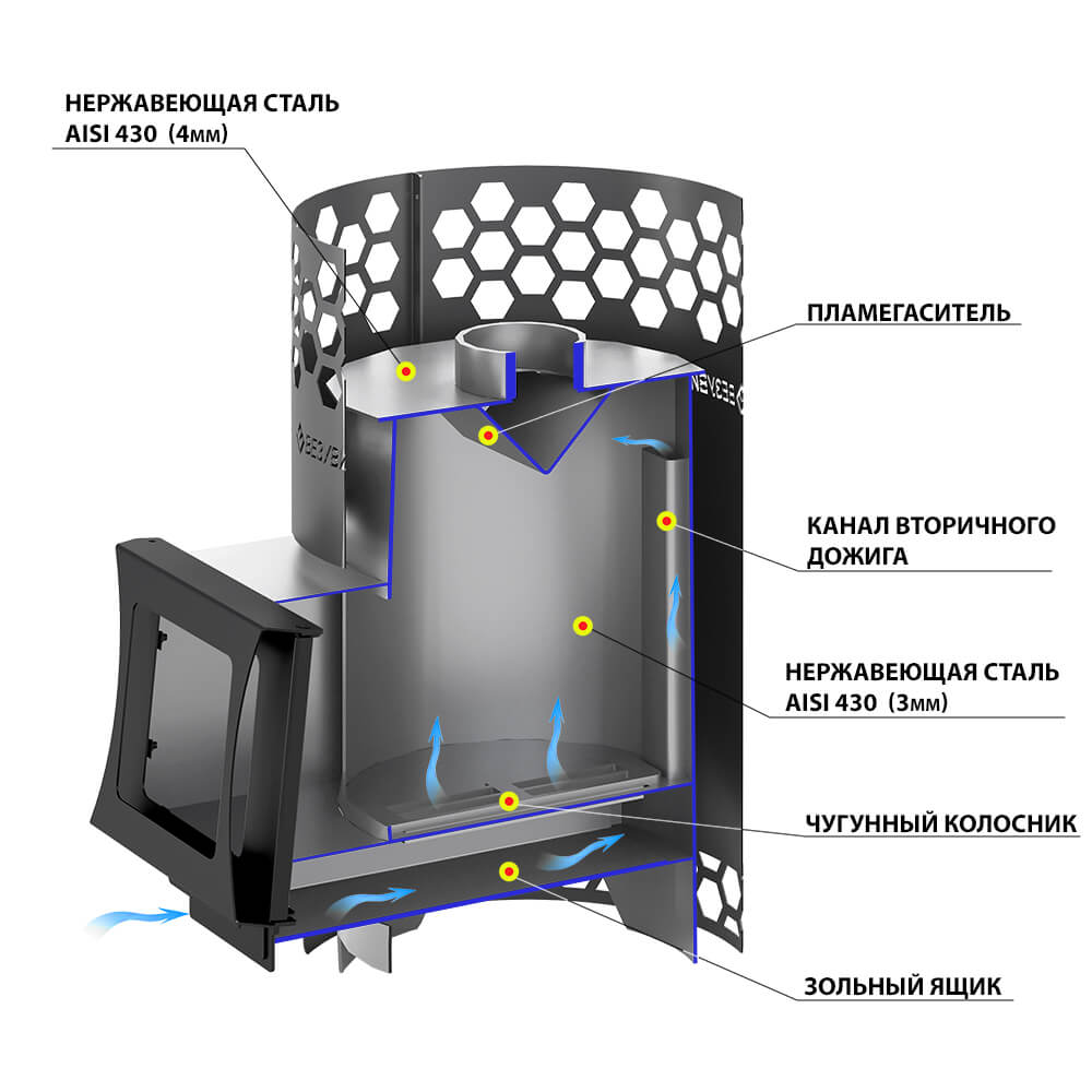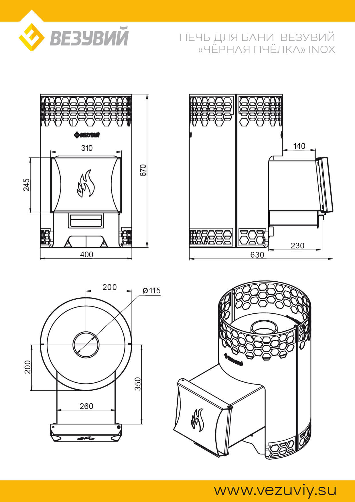 Печь для бани Везувий "Чёрная Пчёлка" INOX — дровяная печь для бани. Банная печь из нержавеющей стали AISI 430. Объём парного помещения от 6 до 14 м³. Каменка открытого типа, вес камней 30 кг. Топочный тоннель с выносом, дверка без стекла.
