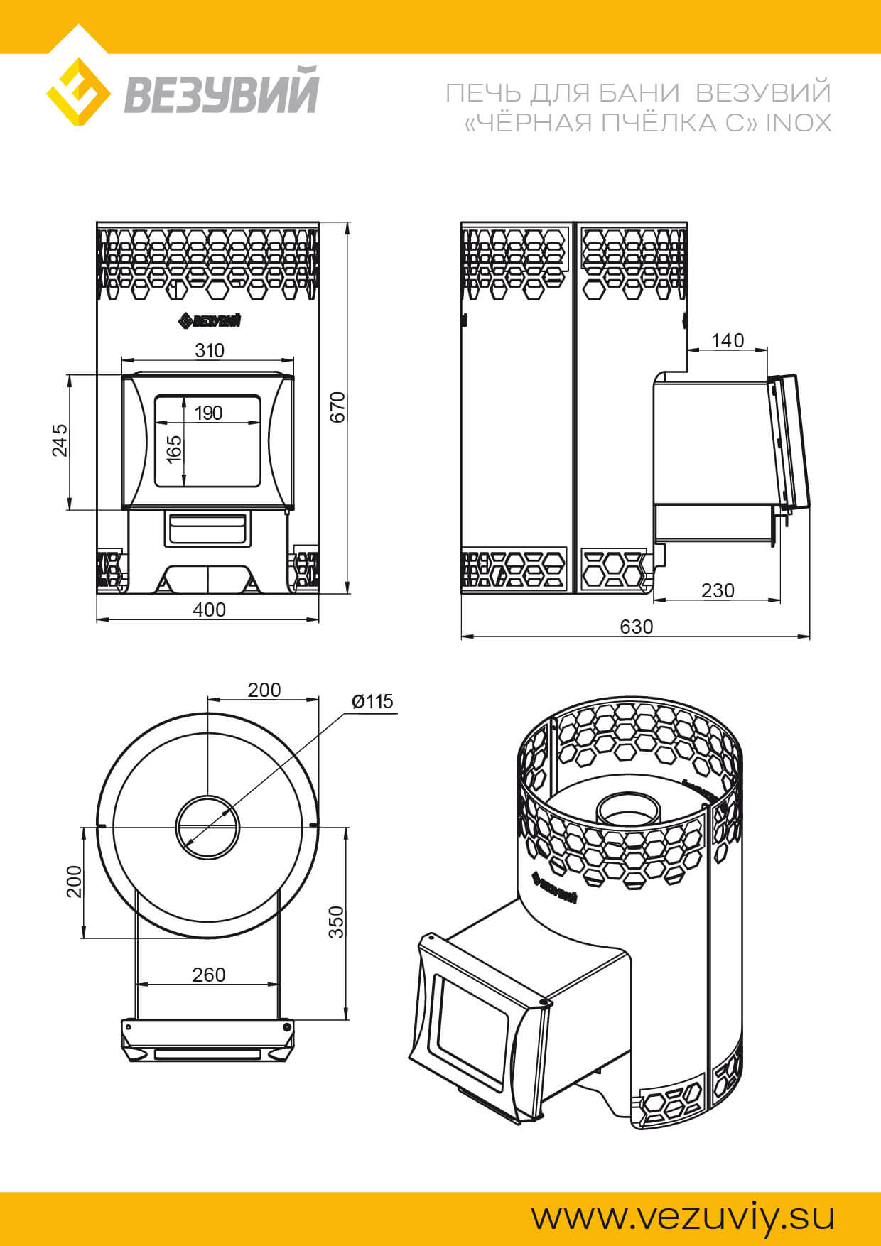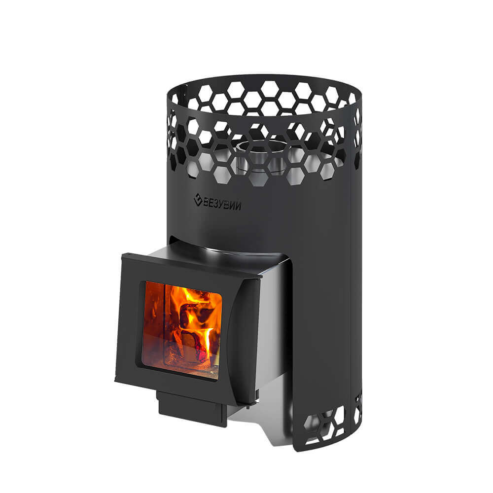 Печь для бани Везувий "Чёрная Пчёлка С" INOX — дровяная печь для бани из нержавеющей стали. Банная печь с топкой из AISI 430 и выносом. Каменка открытого типа для 30 кг камней, дверка со стеклом. Для парного помещения 6–14 м³.