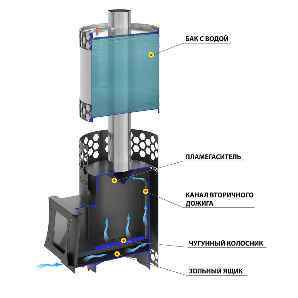 Печь сделана из особо прочной котловой стали марки 09Г2С с толщиной стенок от 3 до 4 мм. Дизайн корпуса печи выполнен в виде сот. Диаметр дымохода 115 мм. Дверка имеет правое и левое открытие. Улучшенная загрузка дров благодаря расположению двери под углом. Печи представлены как со стеклом, так и без него. Так же есть возможность дополнить печь баком на 50 литров, подиумом высотой в 70 мм и фронтальным экраном.