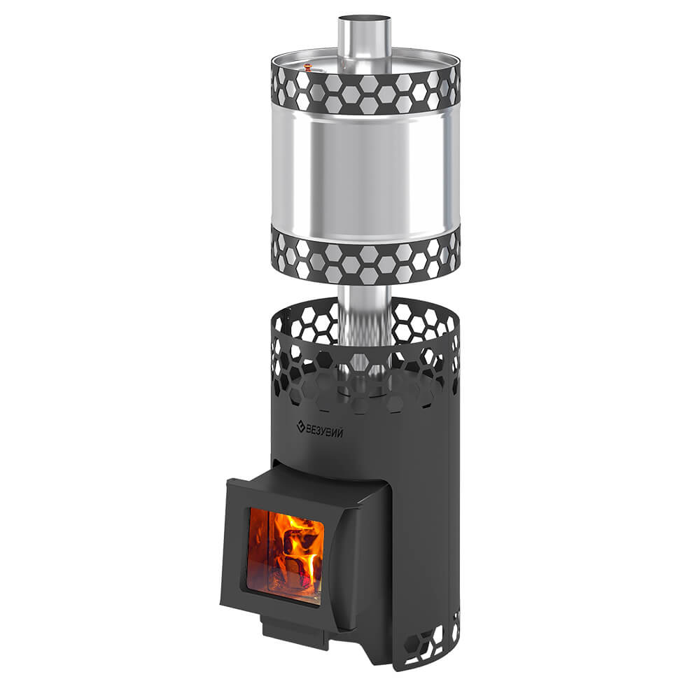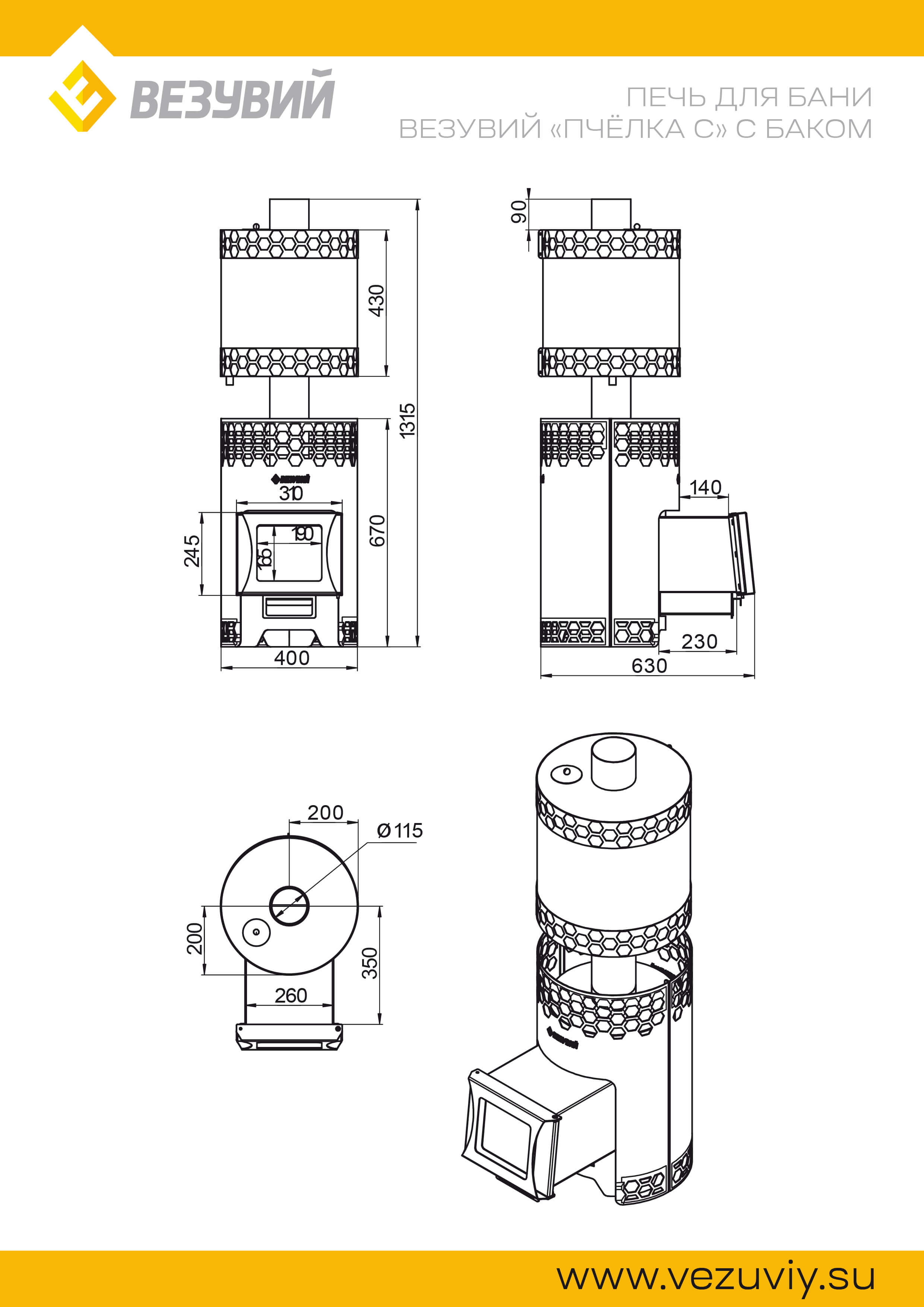 Банная печь Везувий "Чёрная Пчёлка С" с баком для воды, дверца со стеклом, с топочным выносом, с сеткой конвектором, вмещает 30 кг. камней, отапливает парное помещение от 6 до 14 м3.